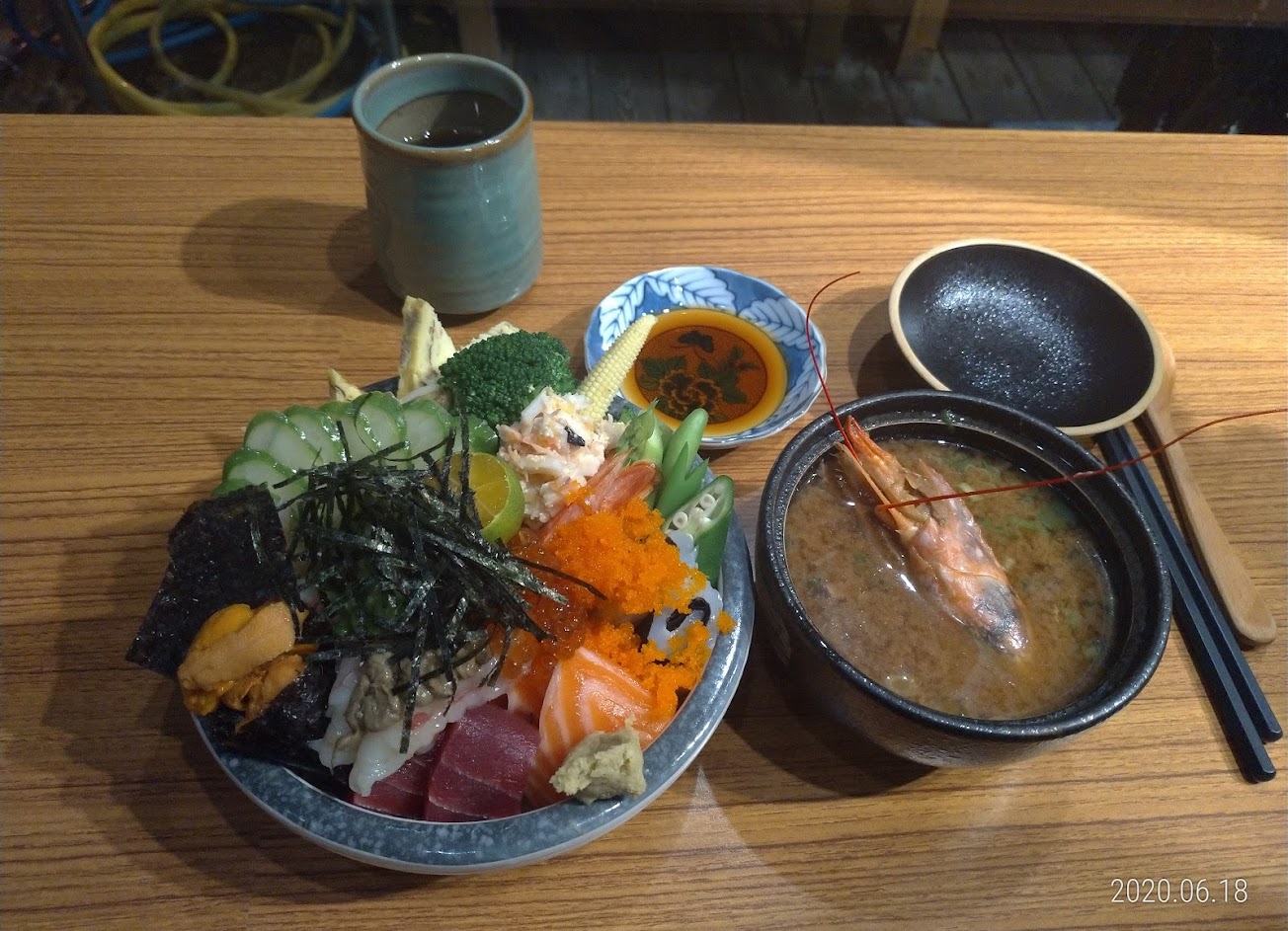 1. 漁人丼:食材超新鮮份量十足CP值破表。首先最吸睛的大草蝦搭配蟹膏,濃郁蟹香跟蝦鮮甜風味互相加乘,滿口濃郁豪華滿足。大片魚片(鮭魚跟紅魽)熟成很好鮨味醇,精選中段無筋口感好,大干貝2顆鮮甜,其他如生花枝捲花,花椰菜跟玉米筍,juicy充滿高湯的蛋卷,都感受到店家滿滿的心意跟堅持,有被深深感動到!