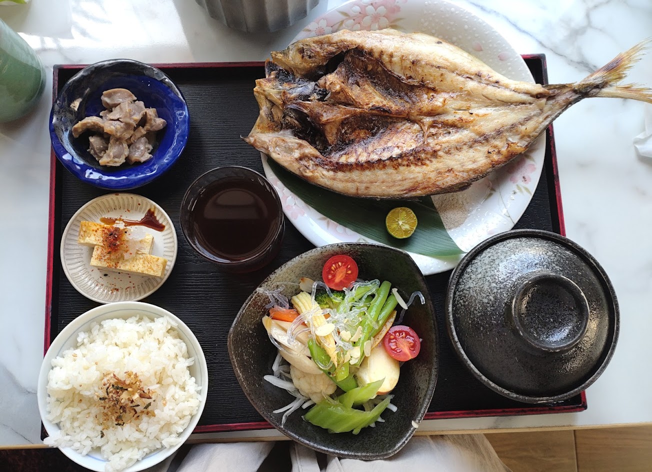 路過覺得應該不錯吃,就進來試試,然後….端上來一條巨大竹莢魚?一夜干(我只想要小小一條試試看捏),驚呆!!!主菜小菜附餐都有水準以上。 #過了一小時只吃了四分之三 #超飽?? #結帳時問老闆定食的一夜干都這麼大? #老闆說我們就是都這麼大條?