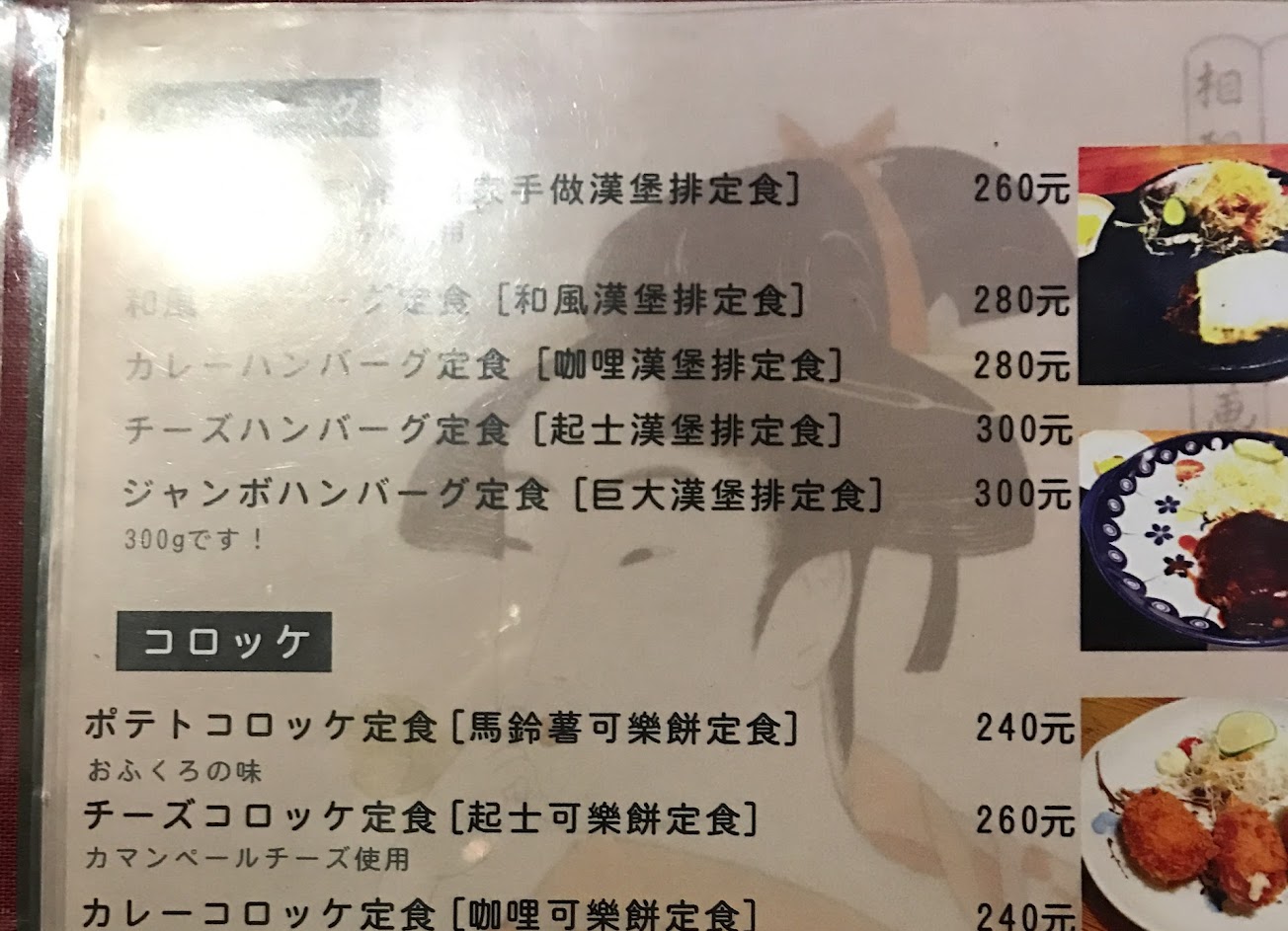 有雙主菜定食可選擇,可以享用兩種不同的炸物,價格視選配的主食而定。一份價格為300~400之間;定食的飯類可以免費續飯。還有許多日本小菜可以選擇,價格都落到100~150之間。