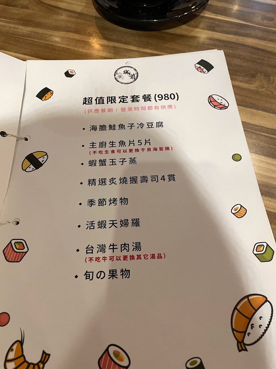 進去就介紹了菜單,我跟老公就慢慢看,因為11:30才開始出菜,後來就點了照片中的品項。