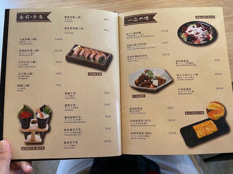 烤麻吉, 蒲燒鰻魚飯, 黑松露蒸蛋, 明太子玉子燒, 鮭魚卵手卷 蘆筍手卷, 綜合握壽司, 海膽鮭魚親子丼, 關西風炒麵, 鮭魚火山丼