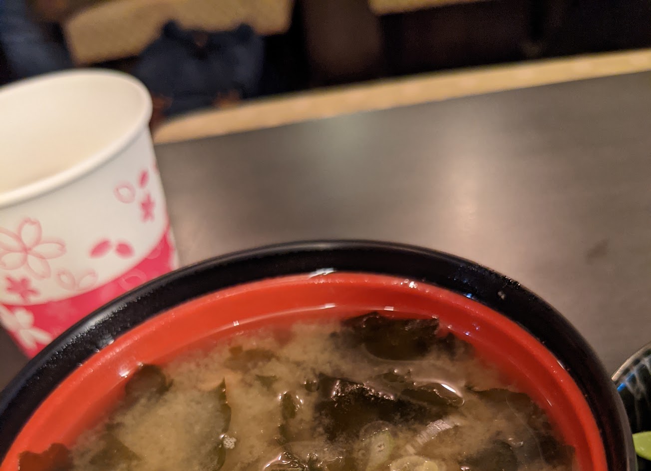除了味噌湯的配料很多之外,它有日本的味道。烤肉丼配上生雞蛋,這在其他國家是很少見的。