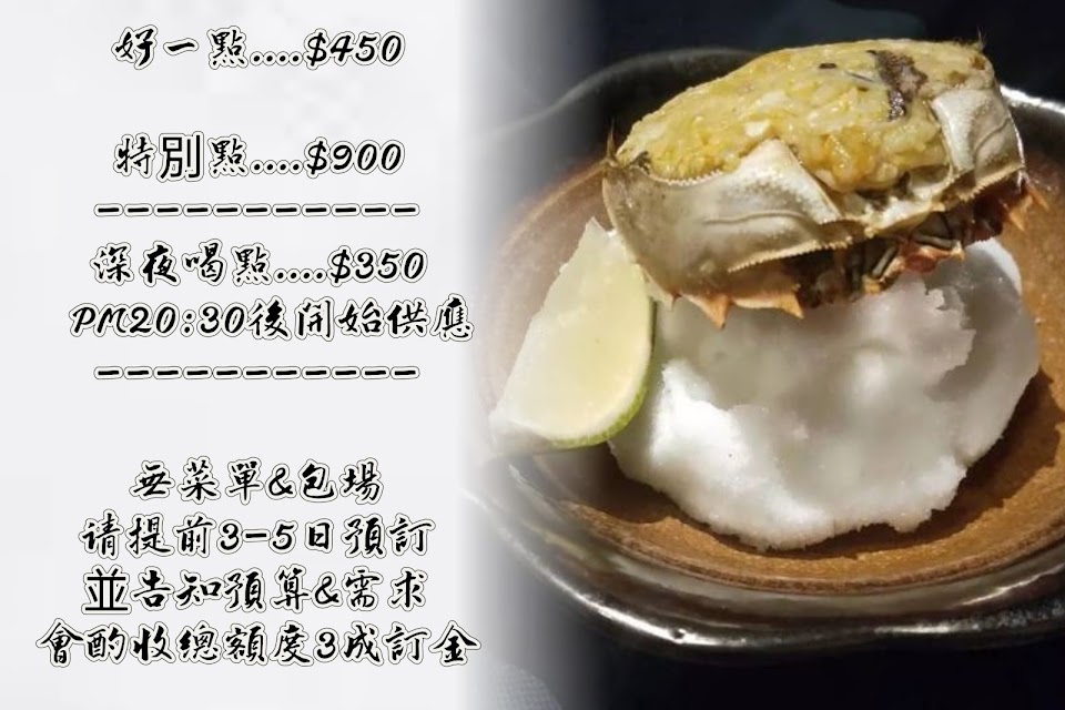 用餐方式是無菜單料理,有兩種品項可以選擇:好一點450元以及特別點900元,這次各點了一份來吃,兩者的差別在於特別點會有多兩道菜,這次吃到胭脂蝦以及鴨胸,甚至還有鮑魚
