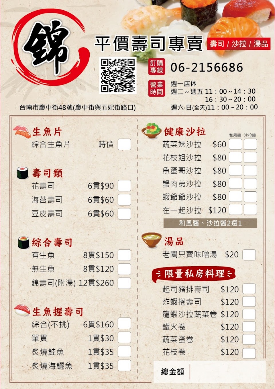 壽司平價新鮮,味噌湯$20元,料非常多 服務人員也很親切,值得二訪