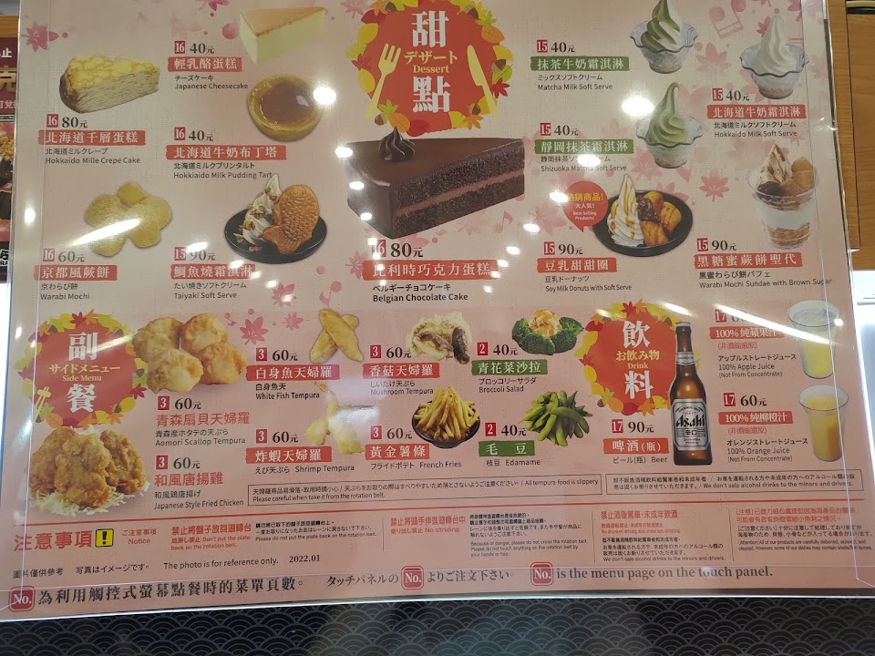 食材算新鮮,偶爾會有新菜單,但是迴轉壽司就那幾樣在變化,其實自己會吃的也就那幾樣而已。只要食材不要變差或份量變小(變相漲價)就好!