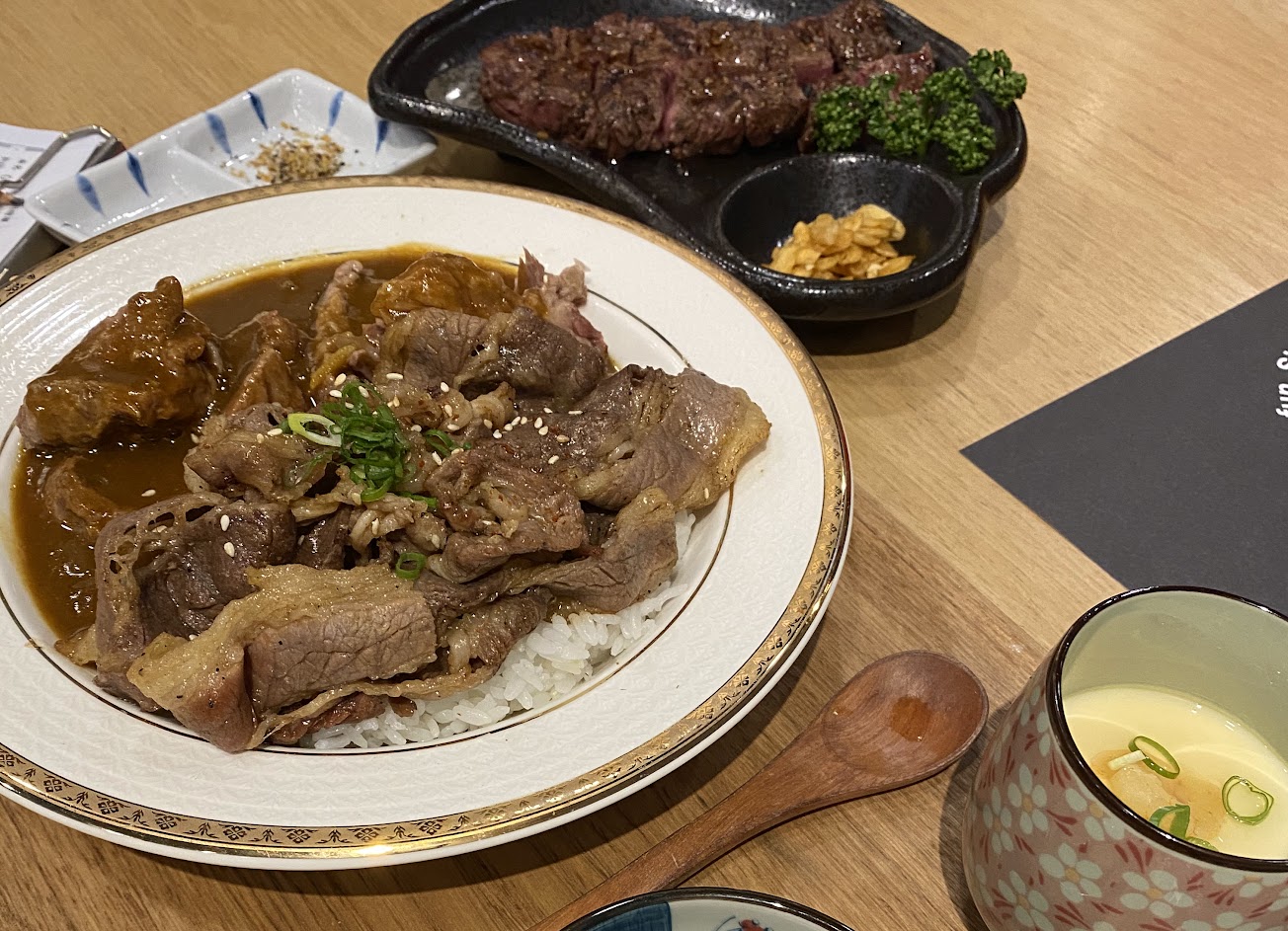 點了炭燒豬跟厚切嫩肩牛。炭燒雖然鹹了點,飯加99$咖喱_真的很好吃。飯吃不飽可以加飯。