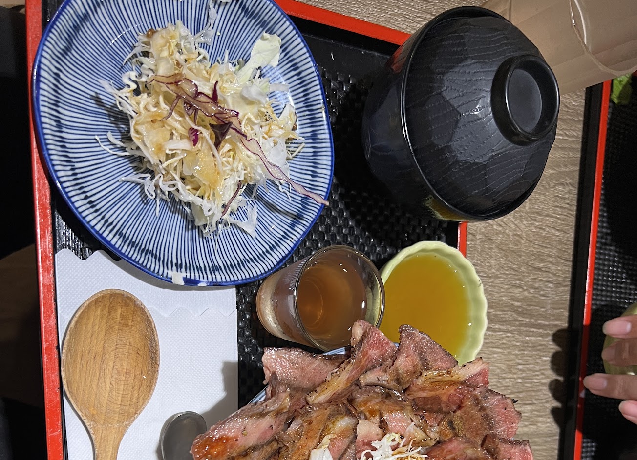 炸牛排套餐 隨餐附的醬油拌飯還有醋做得很棒 味噌湯和甜點的茶凍就比較隨處可見的感覺 比較大的缺點在主菜.炸牛排本身只有裹粉炸沒有任何例如鹽等等的調味.好在沾醬的部分還算成功只是醬料份量偏少.部分牛肉裡有難以咀嚼的筋 石爐上的油非常少.可以理解店家可能擔心顧客被油噴濺燙傷.但也使得幾乎是瘦肉的炸牛排到後來變成在乾煎 單就小份炸牛排套餐而言.成年男性大概是6分飽.建議食量大一點的想嘗試可以點大份的