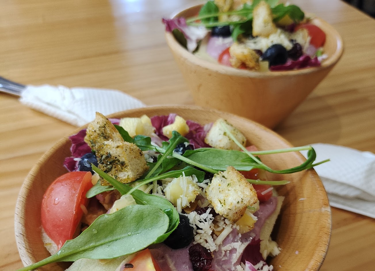 個人沙拉是藍莓優格沙拉,優格醬清爽不膩,沙拉內除了蔬果還有麵包丁及堅果,整體搭配很好