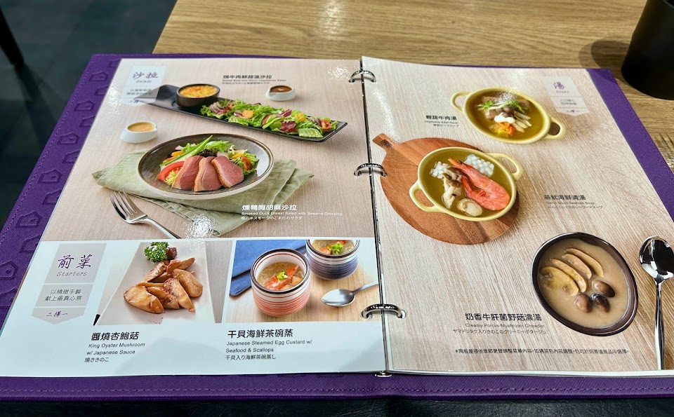 焗牛肉鮮蔬溫沙拉, 干貝海鮮茶碗蒸, 香蒜瓦片牛排, 甜點