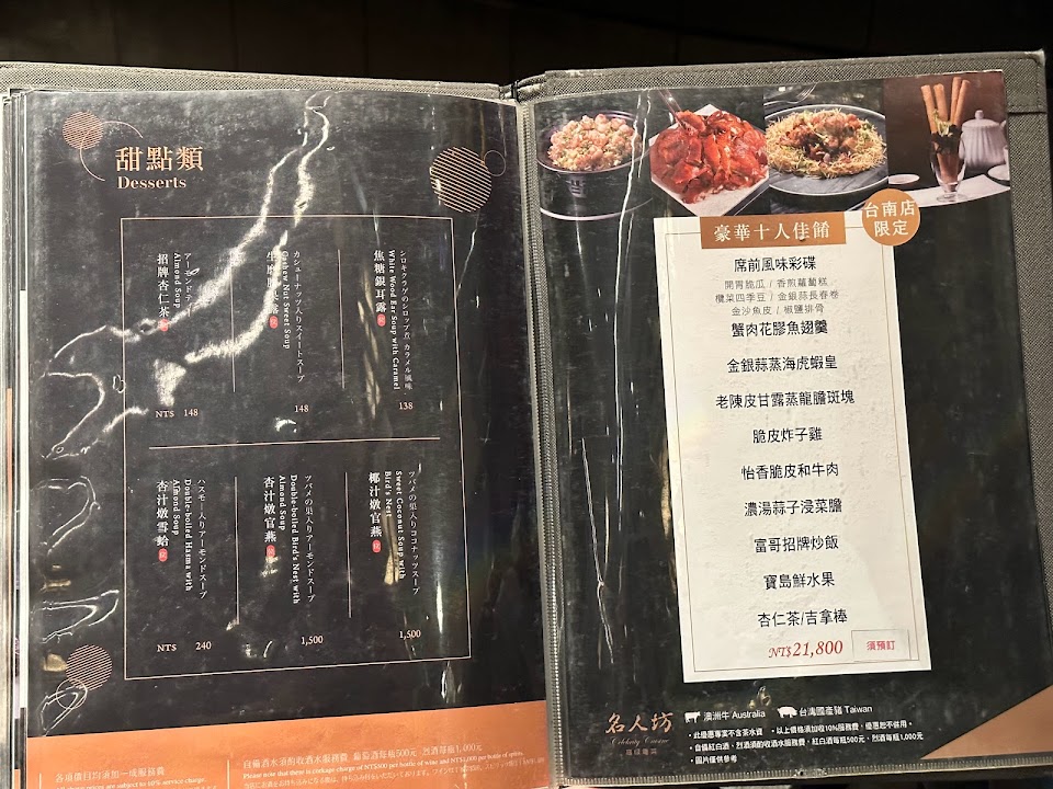 招牌腸粉、金銀蒜長春捲、慶生豬腳麵線、鮑魚燒賣皇、脆片炸子雞、香煎伊比利豬、星洲炒米粉、名人坊脆片叉燒包、壽桃、杏仁茶