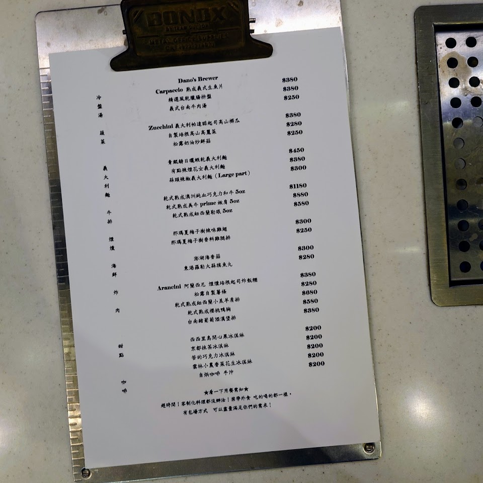 餐點從前菜到甜點,都會不定期更換,依照老闆的巧思以及當令食材。偶爾神來一筆,老闆會將突然發現的美食加入菜單,分享給大家。尤其是近期加入菜單的義式生魚片,非.常.好.吃!魚種也是不定期更換,老闆自己處理熟成,搭配義式的佐料,是非常不一樣的飲食體驗,我喜歡直接吃原味,可以品嘗到完美的肉質跟甜味。