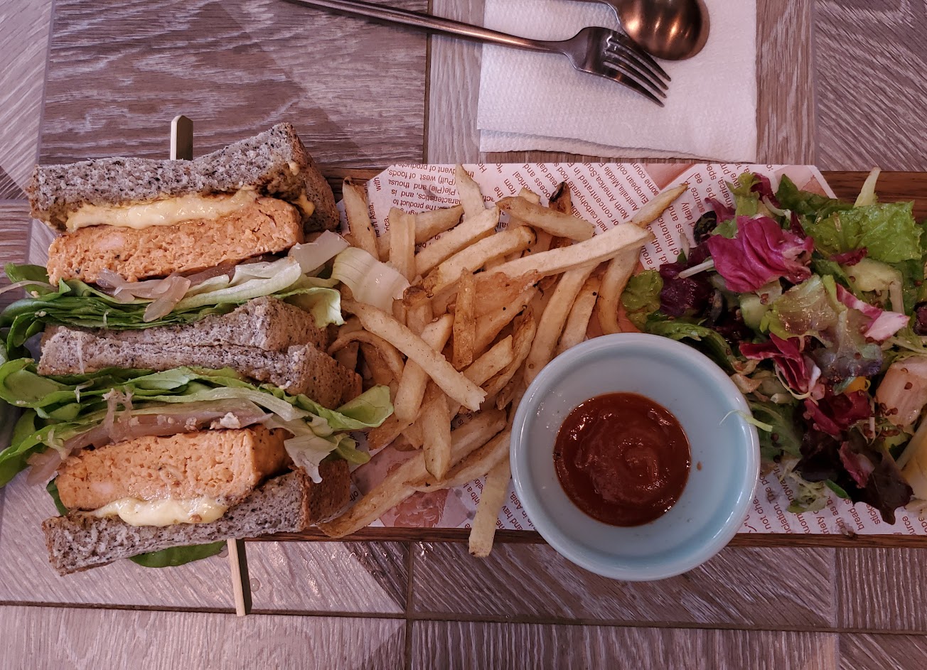 遮目魚堡好吃又特別,不想吃沙拉可以換炒蘑菇,很好吃!份量足夠,環境很好適合與朋友聚餐聊天。