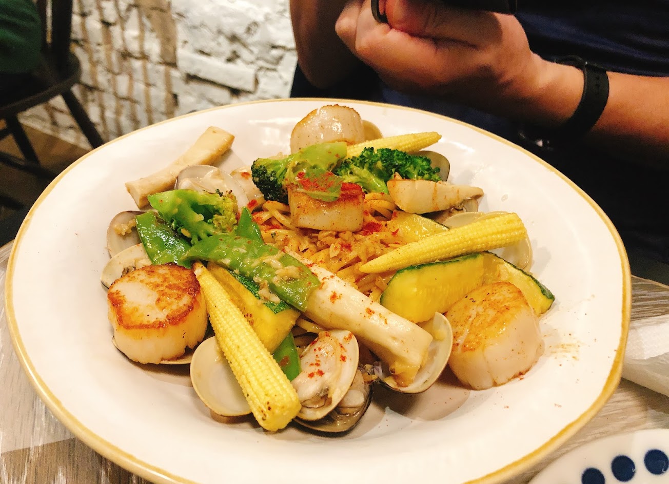 干貝蛤蠣清炒義大利麵的主角海鮮非常新鮮且美味!但是蒜味實在太濃郁!甚至入口咀嚼後還帶點些微的苦味(只有我覺得,另外一位朋友覺得還好,純屬個人感想),把配料吃完以後我也沒法再多吃一些⋯