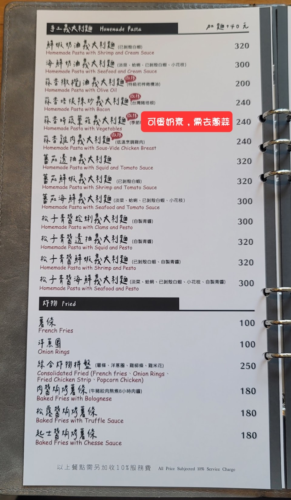 麵的口感很像油麵 一點都不像義大利麵(還有點捲捲的)服務費收一成但是點餐是自己線上點的 碗盤吃完也都沒有收 :)