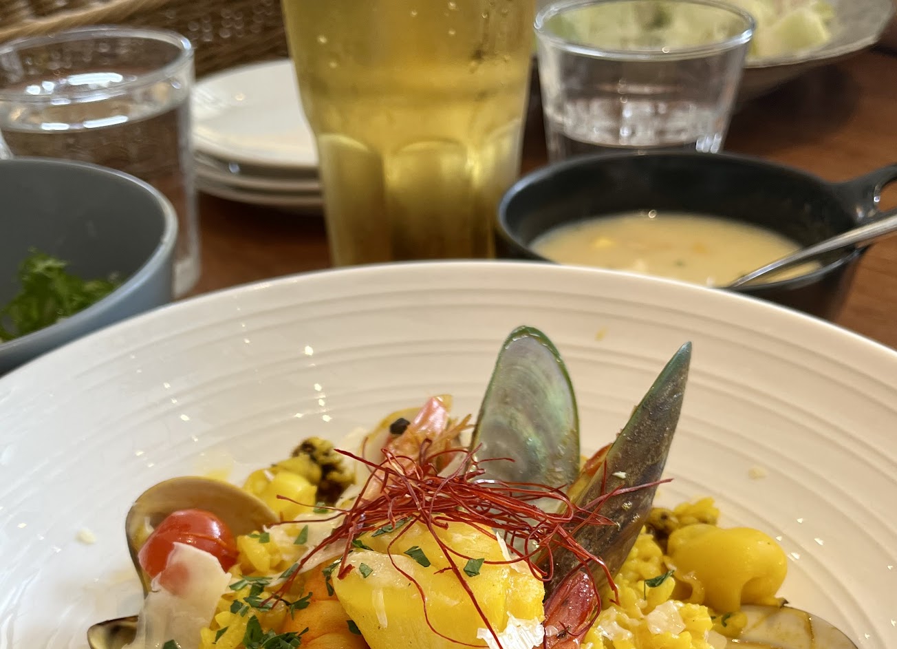 ? 蕃紅花海鮮燉飯:整體味道比較吃不習慣,有蛤蜊、蝦、淡菜、組合干貝和小墨魚(較腥)等海鮮