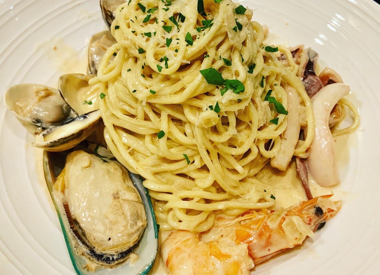 麵條偏硬的乾式義大利麵,奶濃,味道很棒,男生可點加麵+30元,海鮮料很足夠,除了義大利麵外,很推薦炸洋蔥圈,手工做的跟外面比實在好吃不軟爛。