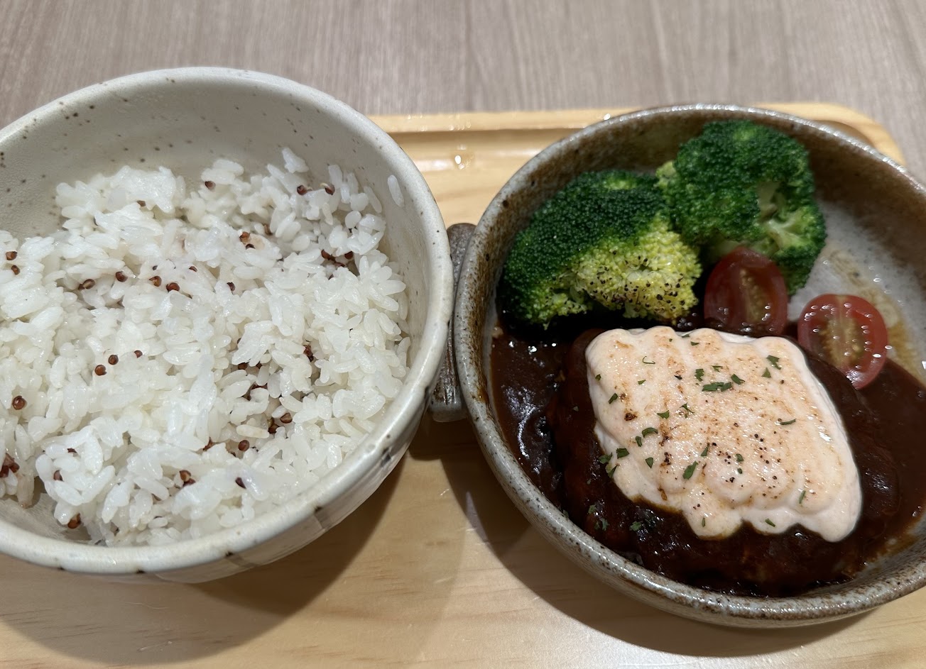 點了2份鹹食,鹹食沒有附飲料,以份量來看價格過高,起司和牛漢堡感覺比麥當勞大麥可小一點點附餐一份薯條,蘿蔔泥漢堡排有一碗藜麥飯。