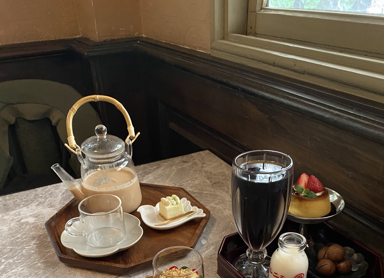 由老宅該建而成,一樓古樸外觀內卻有歐式華麗的家具,有點像是較豪華的昭和時代風格,帶有幾分神秘氣息,加入老派的氛圍與精緻的擺盤,讓人略有一絲不真實的夢幻帶入感,點了馬可波羅鍋煮奶茶,是好喝的,生巧克力普普,抹茶與布丁沒吃到不做評論,需要手開的夏威夷豆很有趣,二樓則是採光良好的榻榻米,較舒適但與一樓是截然不同的感覺,位子不多,建議儘早來候位。