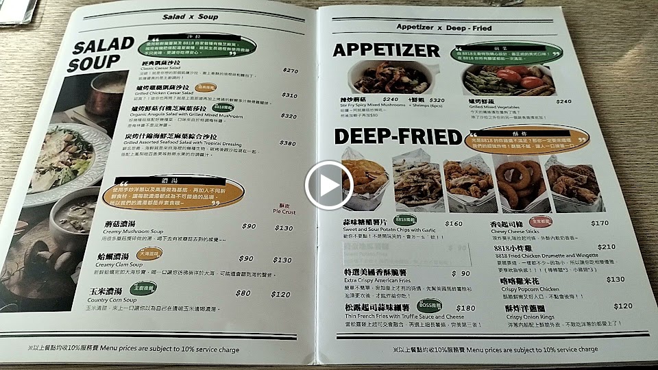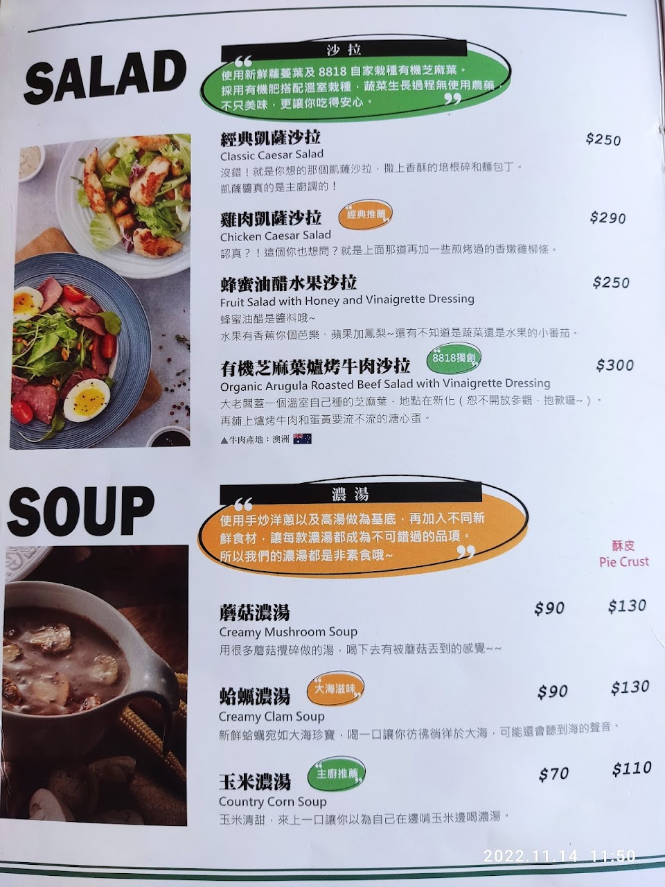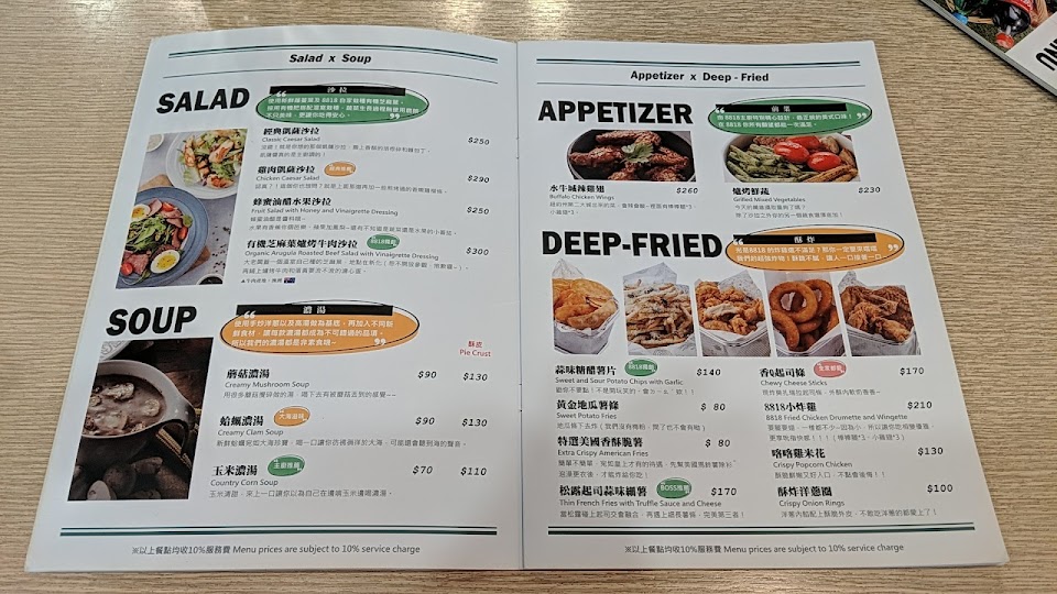 爐烤時蔬, 8818經典炸雞, 蘋果披薩, 超級夏威夷, 夏威夷披薩, 蘑菇濃湯, 海鮮總匯pizza, 炸薯條, 瑪格麗特披薩