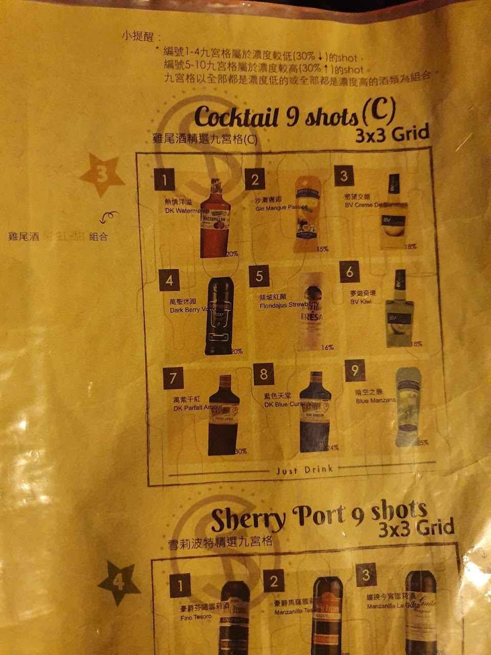 25宮格,有些酒沒攪拌,糖漿跟酒都沉在下面啦,整體不錯,玩的high,飛鏢機好玩