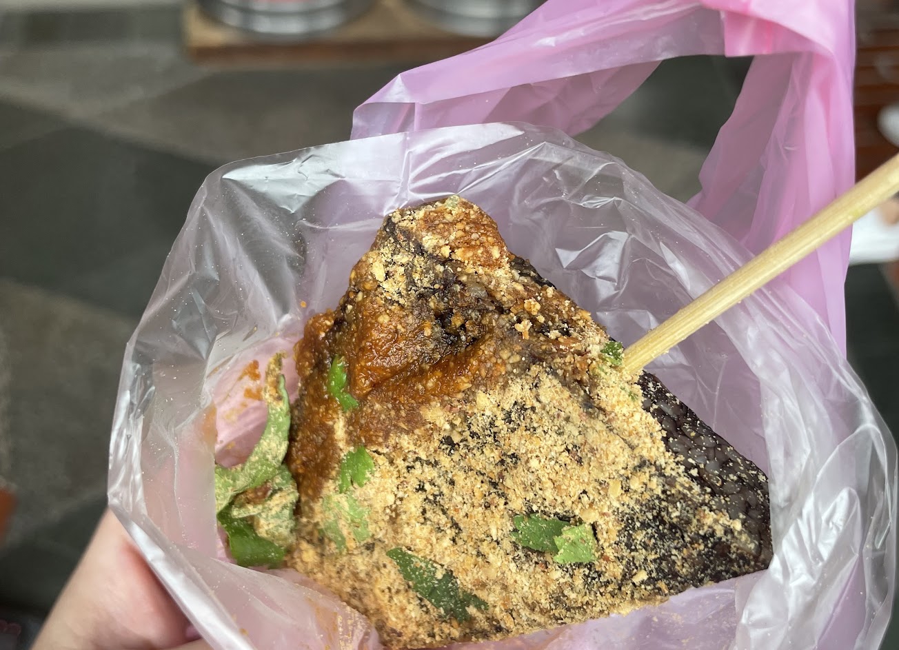 2022-1228 他的豬血糕真的是三角形的,一支只要20元,老闆會問你要不要加香菜和辣味。