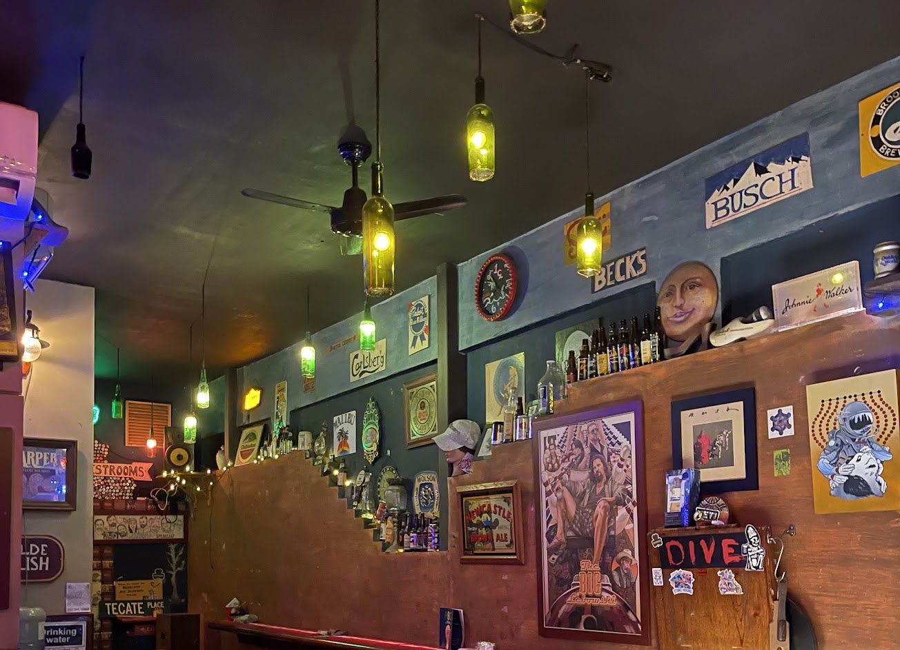 酒吧裡擺滿了世界各地的古董標籤、復古招牌、標誌、精神板和搖滾樂團海報。