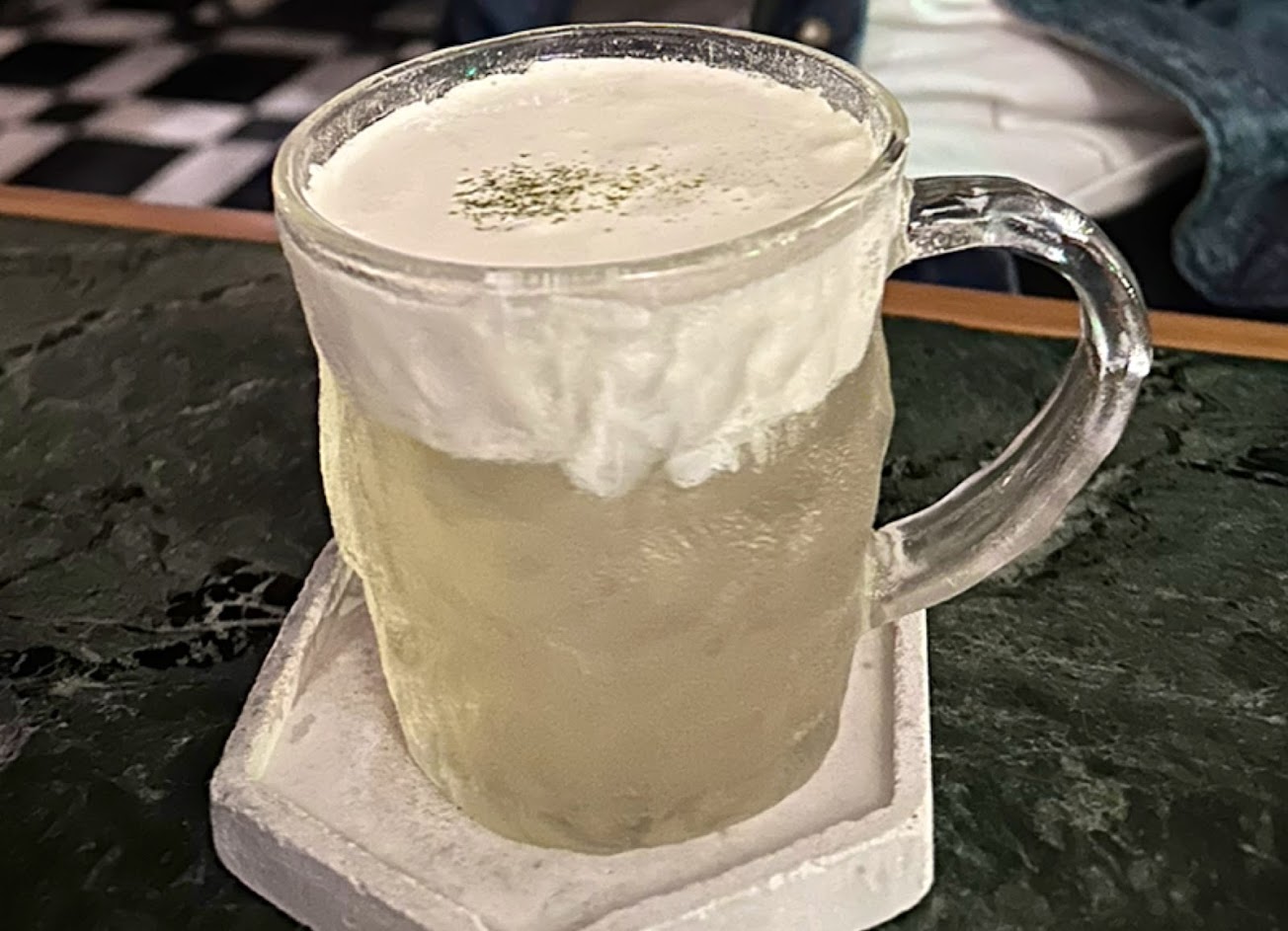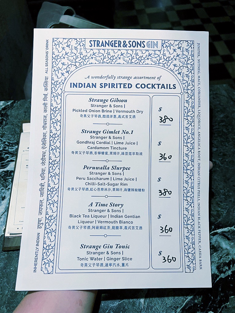 一看到這神奇的成分我就很好奇,Bartender解說這杯調酒的發想是鹹粥,表層的泡沫是用昆布高湯打成,除了略有小鹹以外,還吃得出香菜和芹菜的風味,還有點花生的風味,說是鹹粥,倒是讓我想到潤餅。最上面放著酥炸的油條,配酒吃真的很有意思,酒體帶著不強烈、微偏酸的酸甜調,很特別的一杯調酒。