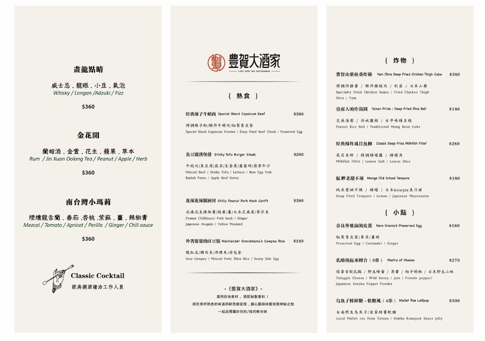 想起去年要去二店找不到路 鬼打牆 又客滿狀態 這次運氣好一點 可能是平日的關係 三店的風格蠻特別 外觀跟內裝潢 都很衝擊 但服務態度非常棒啊 謝謝老闆的招待 餐點部分也是很好吃