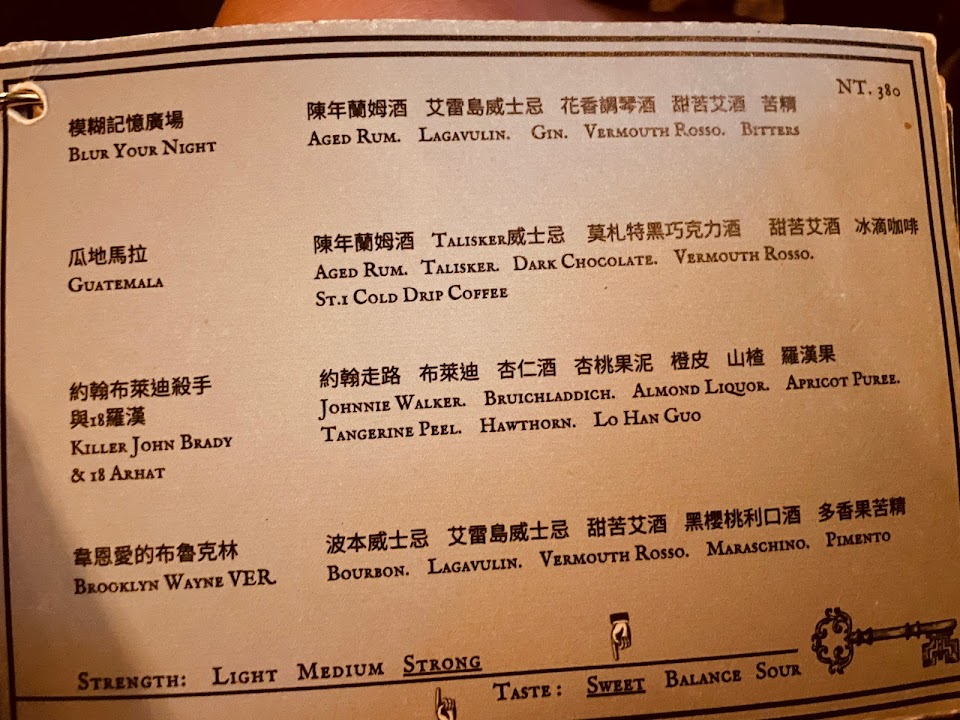 真的很喜歡這間店的氣氛 很熱鬧但又不會讓人覺得吵雜 調酒師的寒暄跟顧客的對談及空間裡的擺設 連廁所都是非常的有設計感 整體的感覺很復古 也有很多收藏 調酒都是店裡的特色調酒 且店員也會因你喜歡的口味推薦你適合的調酒 非常的親切 且空間也很大 如果多人的話 它還有一個包廂 但是都偏向有加威士忌的酒款 但對於我來說真的是不太愛那個味道 威士忌雪捲 有加入泥煤味的威士忌 有點不太能接受 除此之外 其他的基酒所搭成的調酒也都讓我很滿意 有點美中不足的部分是相較於其他的酒吧 他們的營業時間只到1點而已 真的比較可惜 而且他的低消是750 基本上就是得點兩杯才有辦法到達 裡面也有很多小吃 所以是不能帶外食的 加上它們的生意很好 基本上是一定要訂位的 但是會讓我想二訪的店家 餐點類型 其他 平均每人消費金額 $800-1,000 建議的餐點 美國人吃葡萄 艾雷島榛果餅乾