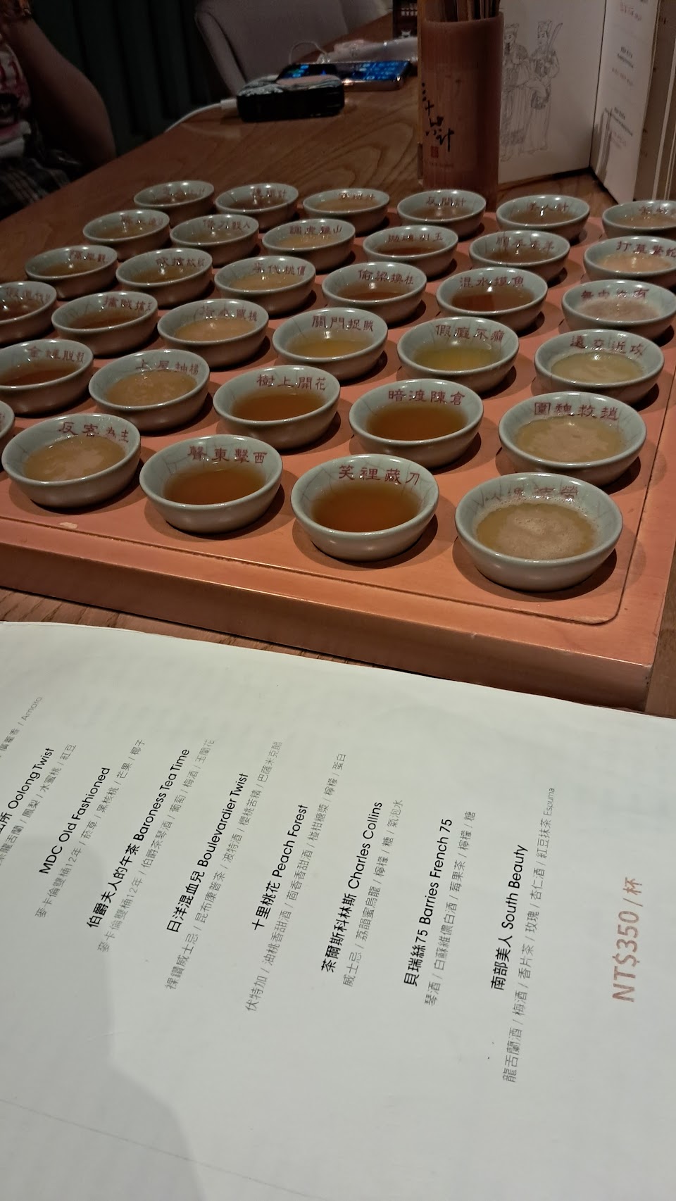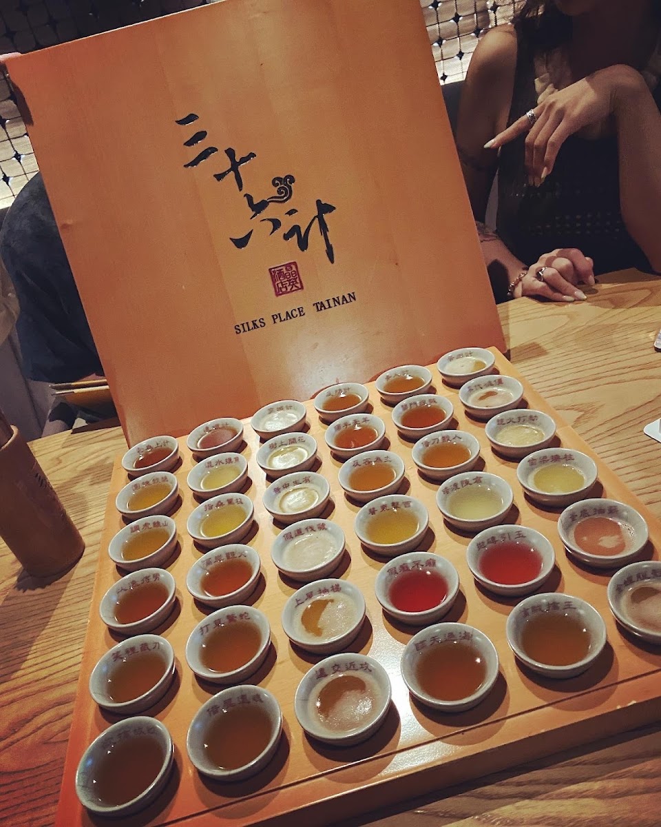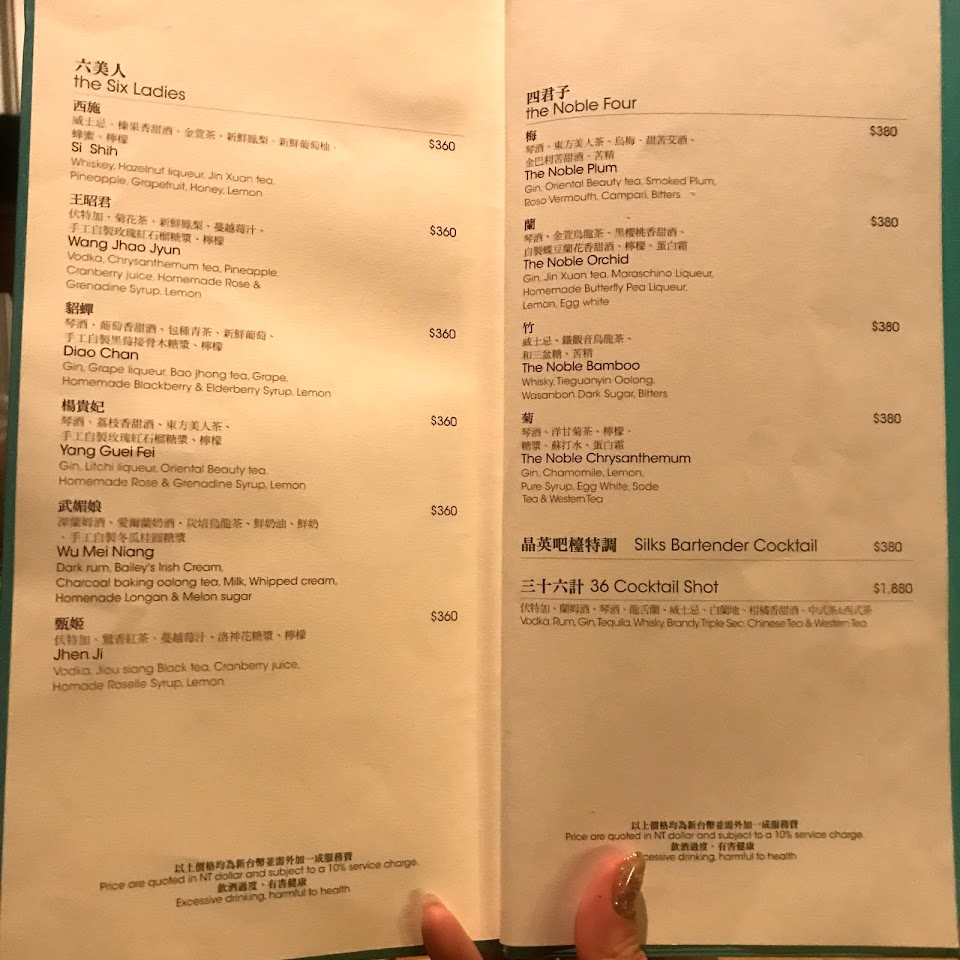 台灣茶的部分有鷲香紅茶、鐵觀音、東方美人、茉莉香片、金萱、仙女紅茶等六款,而西方茶則有伯爵紅茶、黑莓接骨木茶、洋甘菊茶、檸檬柑桔茶、約克夏紅茶以及蘋果紅茶,再渴入伏特加、萊姆酒、琴酒、威士忌、白蘭地、龍舌蘭等美酒,當中還加入天然果蓉,而所有茶酒杯子上展示了中國古兵書三十六計,看看我能否拋磚引玉調虎離山取勝飲少點嘻嘻。