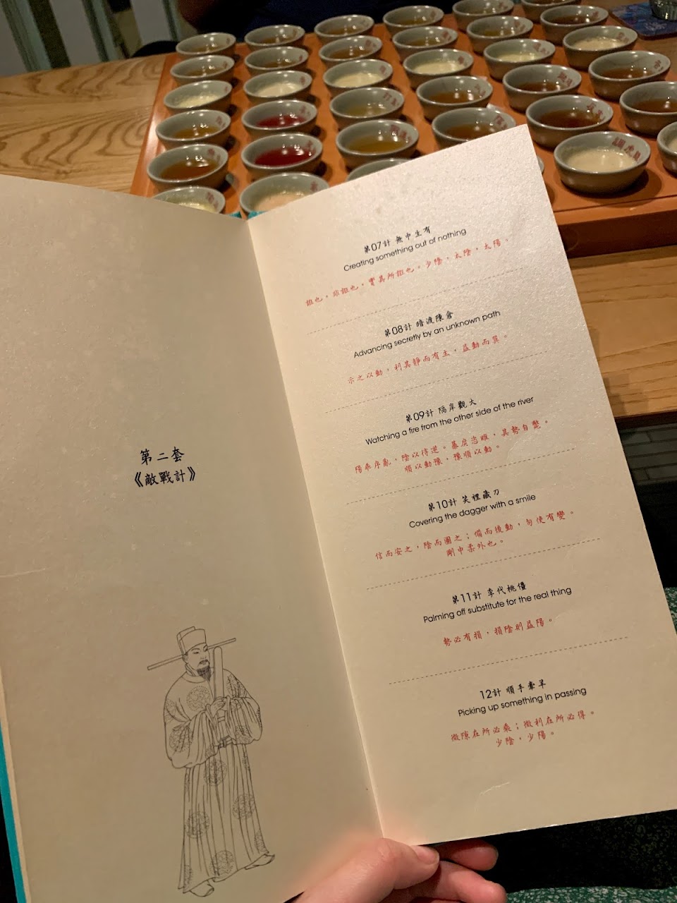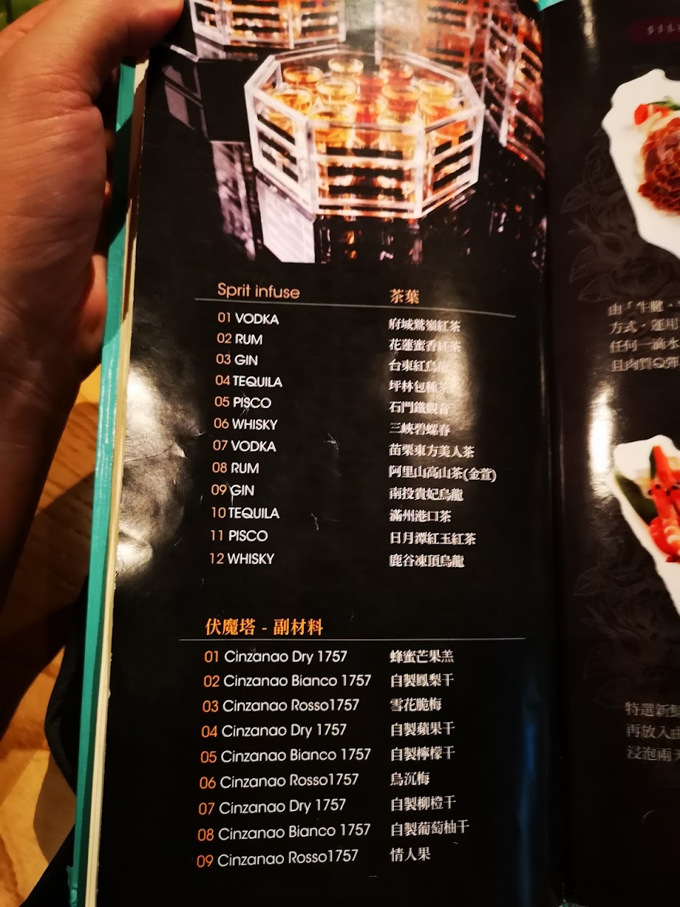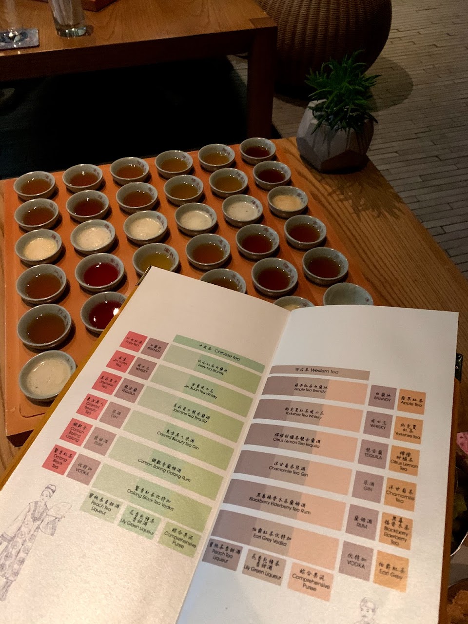 台灣茶的部分有鷲香紅茶、鐵觀音、東方美人、茉莉香片、金萱、仙女紅茶等六款,而西方茶則有伯爵紅茶、黑莓接骨木茶、洋甘菊茶、檸檬柑桔茶、約克夏紅茶以及蘋果紅茶,再渴入伏特加、萊姆酒、琴酒、威士忌、白蘭地、龍舌蘭等美酒,當中還加入天然果蓉,而所有茶酒杯子上展示了中國古兵書三十六計,看看我能否拋磚引玉調虎離山取勝飲少點嘻嘻。