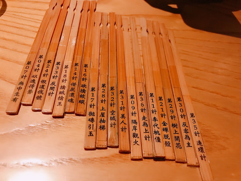 1.訂位時提前預訂36計,一套1800元+10%,還不錯玩,每套有各自的抽籤筒、籤上還有英文可以玩猜猜看。