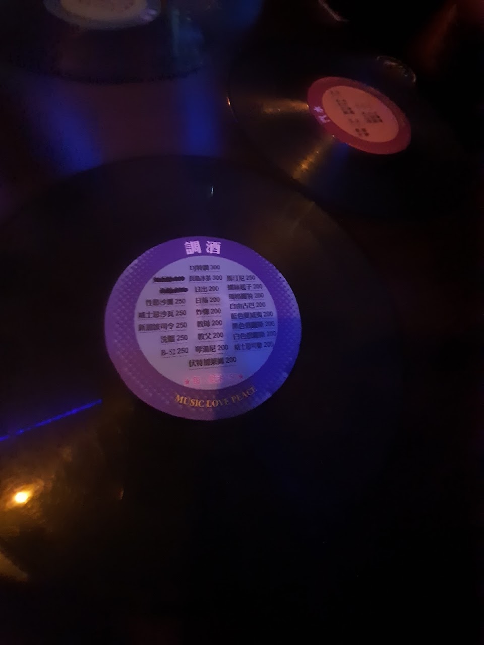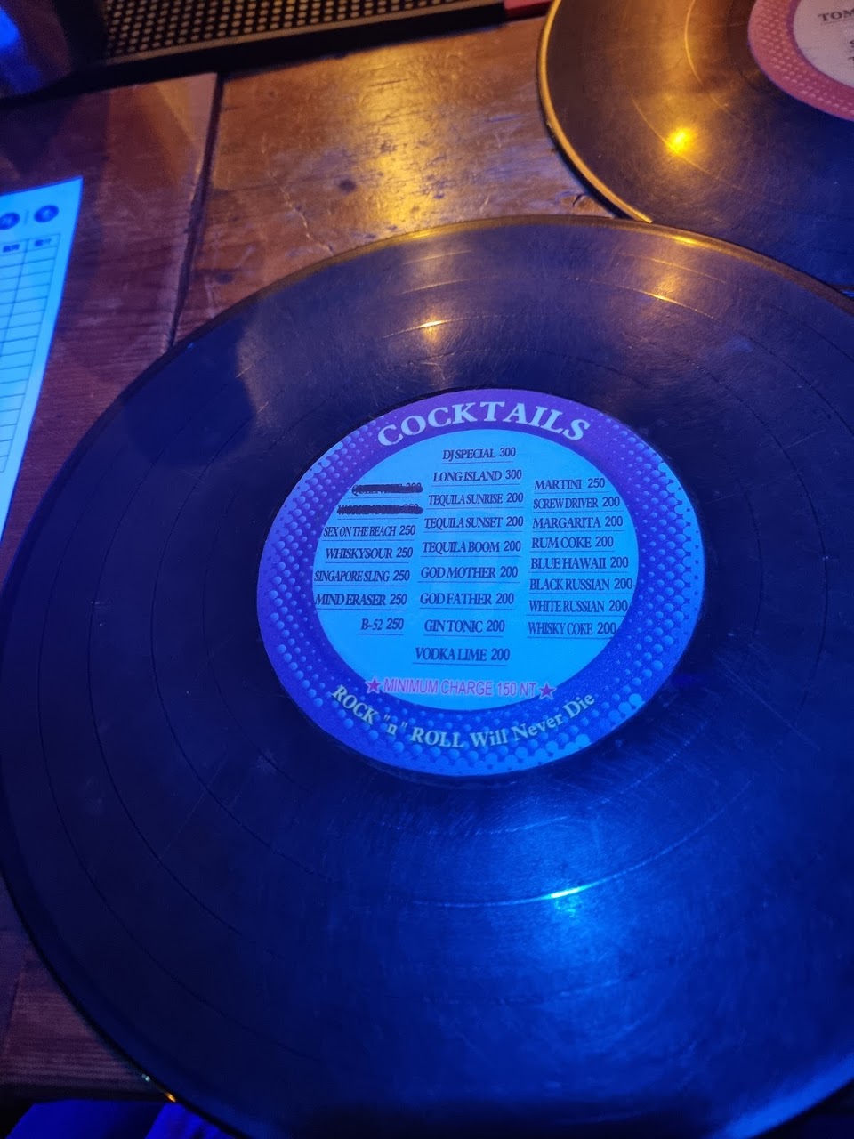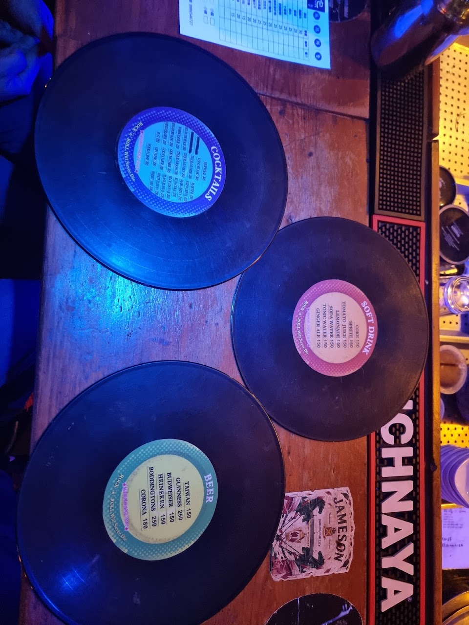 好吧,來到他們的菜單——它是音樂唱片的形式,非常簡單和優雅。他們確實有瓶裝啤酒,但生啤酒不多。接下來是食物,他們不做任何食物,但你可以從入口處的燒烤店訂購,那傢伙幾乎是不可能的,他的燒烤肉是酒吧里最好的東西?。