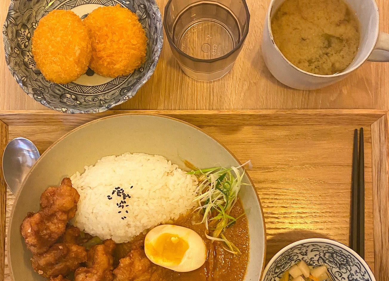 咖哩與一般吃到的咖哩粉或咖哩塊口味不同,比較像是自製熬製的,滿特別也滿好吃的,唐揚雞炸的很剛好,咬下去有滿滿的肉汁,店內氛圍也不錯,會想再訪,再吃吃其他不同餐點。
