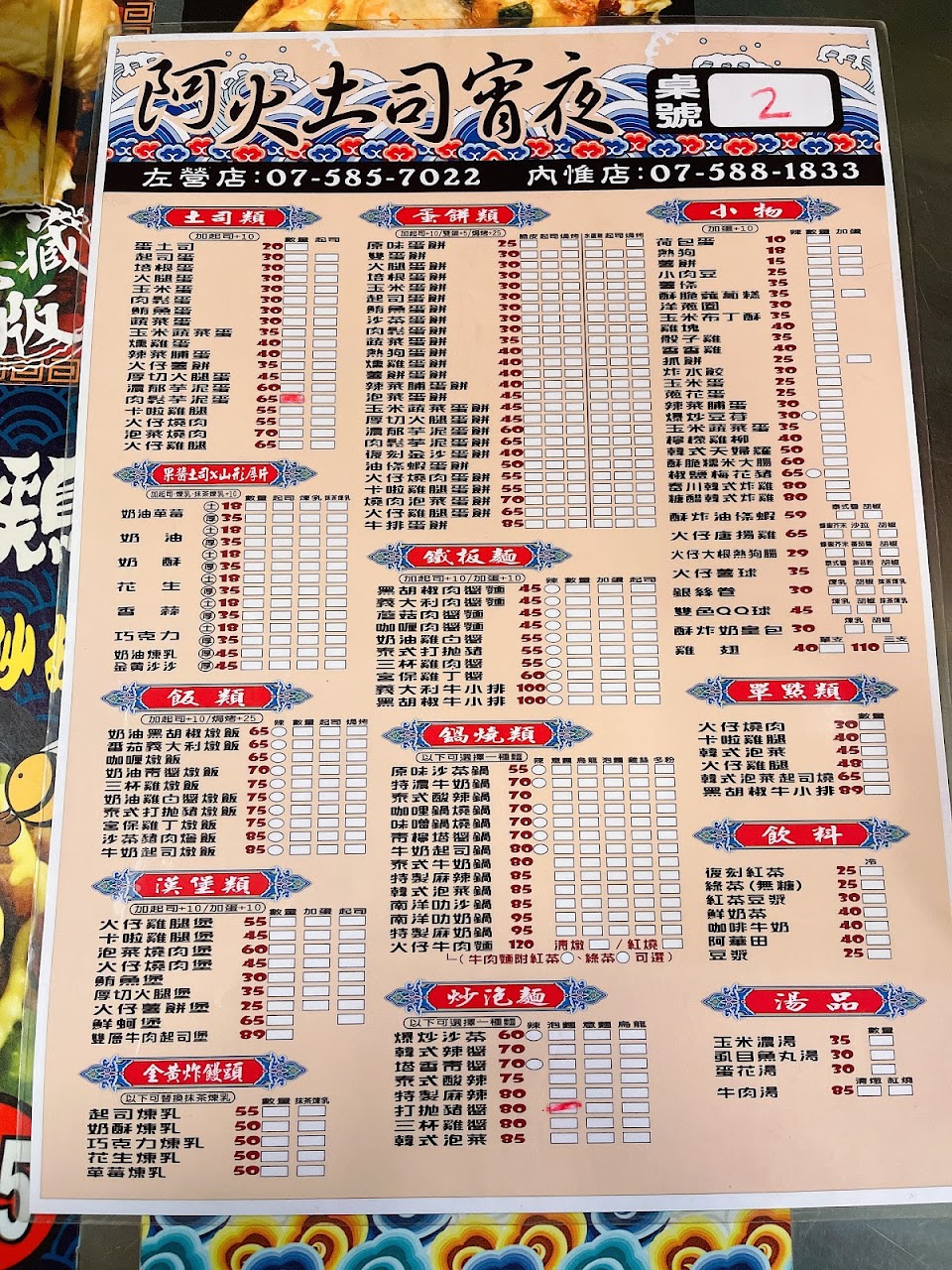 3人點一個厚火腿蛋吐司、一個芋泥吐司、一個玉米蔬菜蛋餅、一份小肉豆、一杯紅茶 這樣的宵夜200元,不想吃太飽份量剛剛好,味道不錯,麵糊蛋餅好吃、紅茶就滿口紅糖味但沒有甜到膩 很餓、趕時間、真的不推薦,只有3個人服務耐心等待吧! 目前還是二級疫情狀態店員只有1人戴口罩 因為是外帶,無法感受店內環境如何 還是會再訪的店,畢竟蛋餅真的比隔壁的‘阿博豆漿’不油(一樣都是蔬菜蛋餅,比較推薦阿火)