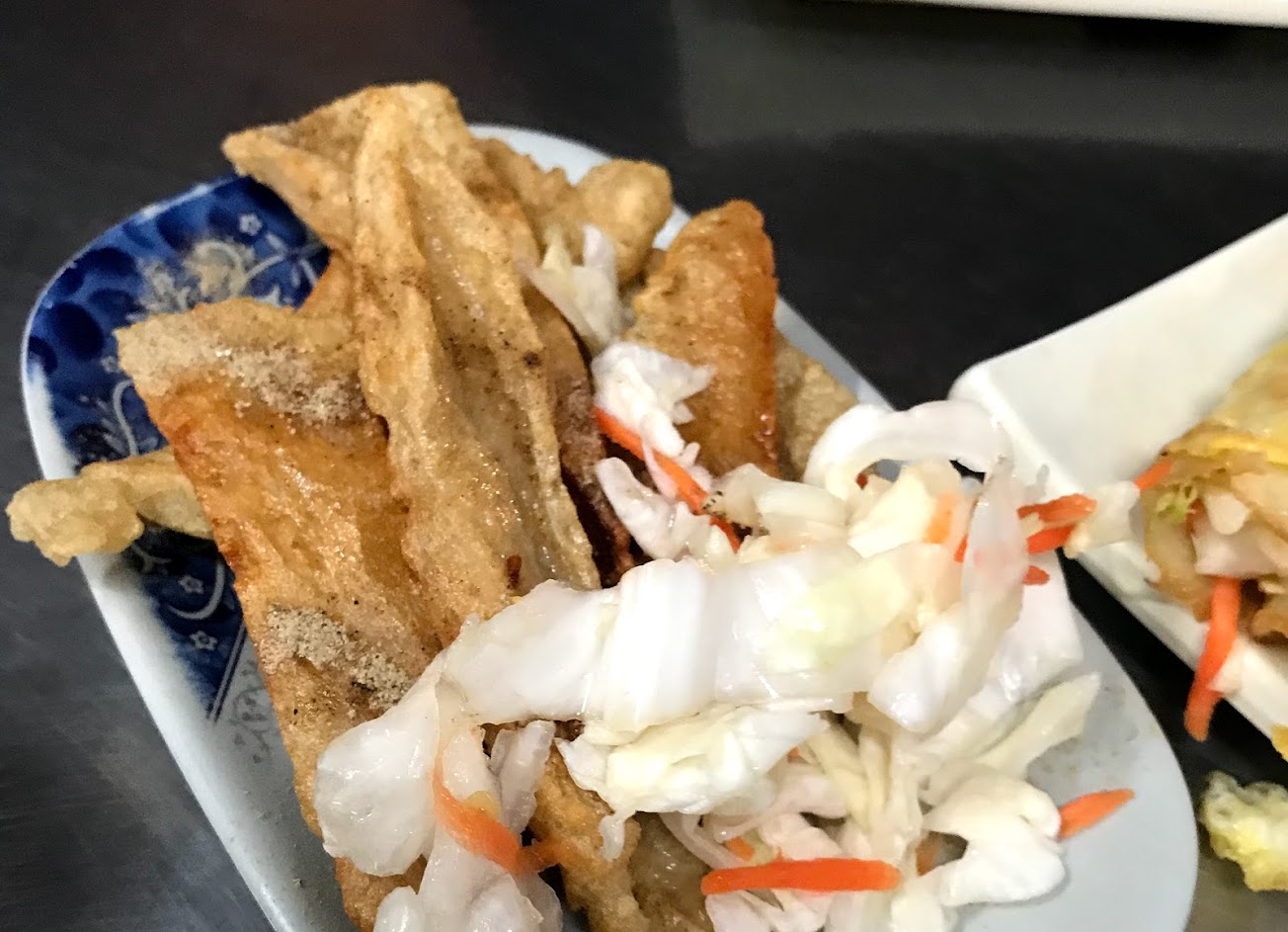 今天點了泡菜天婦羅(就是炸黑輪+台式泡菜)、九層塔蛋餅、鮪魚蛋餅、杏仁茶。 整體上還可以,不會想特別來吃,天婦羅炸的偏硬。蛋餅份量蠻大的!杏仁茶不熱有點甜。 但是生意很好,20:30開門就有很多人在吃。