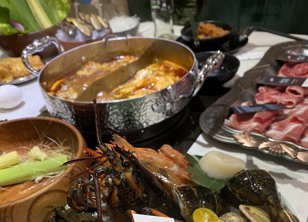 一開始經過以為是高級精品店 沒想到是裝潢氣派的火鍋店! 一走進店裡由親切的服務員介紹環境 店內非常寬敞明亮又很好拍照 醬料區旁邊還看得到活生生的龍蝦? 湯底是孜然和麻辣 點了雙人海陸套餐 和牛的油花分布均勻 涮一下就入口即化 令人驚艷的是龍蝦海鮮拼盤 有野生花蝦、胭脂蝦、大天使紅蝦、大干貝、牡蠣⋯等等 肉質鮮甜 而且份量多 喜歡海鮮的不要錯過這道! 服務 內用 餐點類型 晚餐 平均每人消費金額 $1,600-1,800 建議的餐點 文蛤, 波士頓龍蝦, 6盎司霜降牛, 北海道野生花蝦, 套餐菜盤, 孜然鍋 和 豬肉盤, 大天使紅蝦