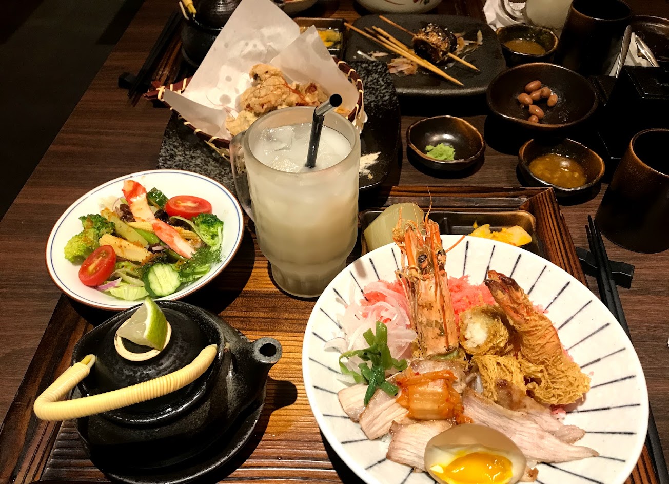 招牌墨吉丼:內容物有抱卵的干貝兩個、草蝦一隻、鯖魚、雞肉、豬肉、溫泉蛋、少許蔬菜。