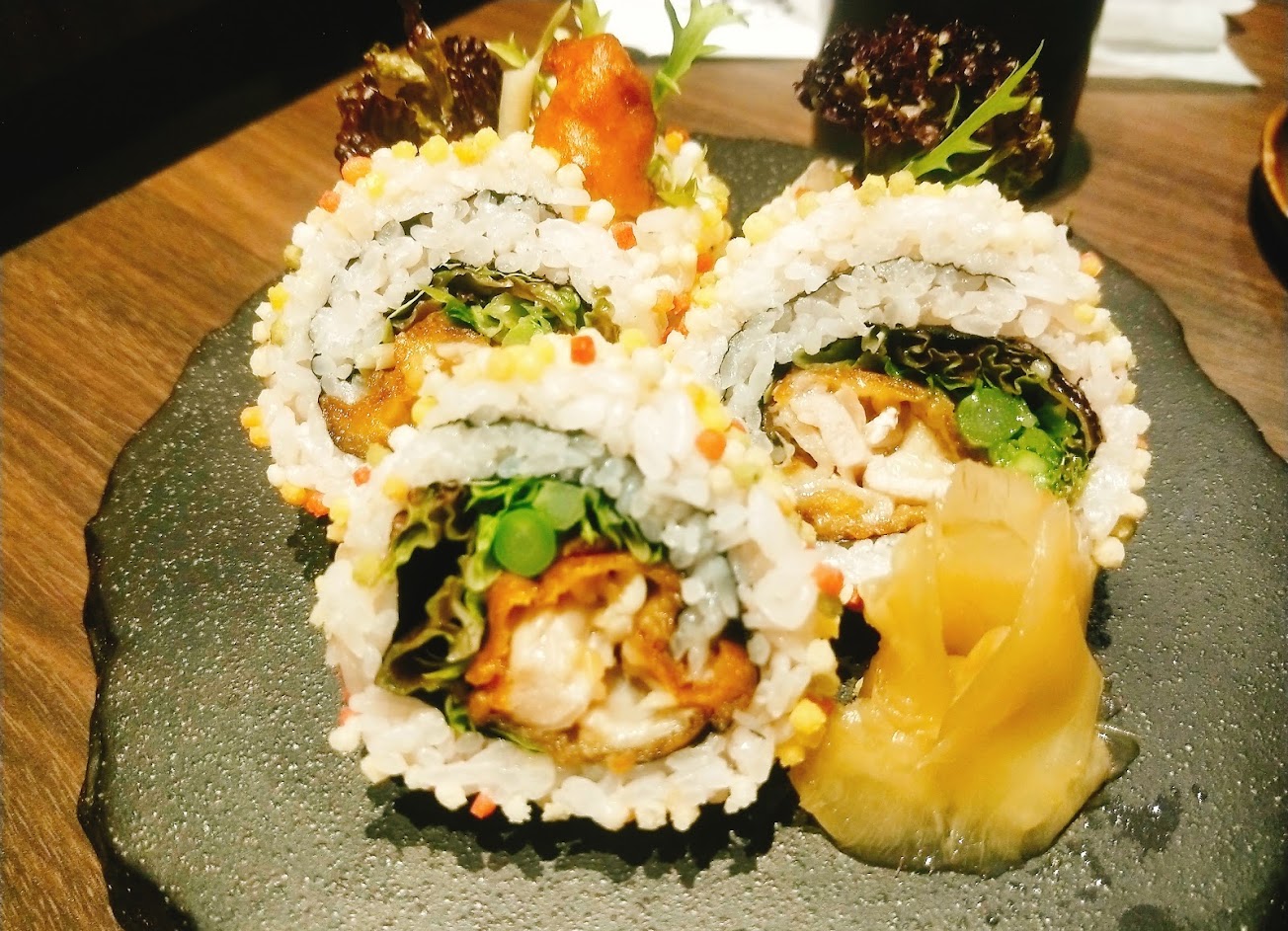 裝潢不錯、用餐環境大、食物看起來很好吃……但其實並沒很好吃,只有毛豆很好吃,但沒想到毛豆只能免費續盤一次,原本想給3顆星的心情就沒了…… 哦還有……鰻魚箱握壽司太薄了,別點。 櫻桃鴨鵝肝握壽司不知道怎麼處理的,完全把鴨肉的靈魂給撲殺的一乾二淨。
