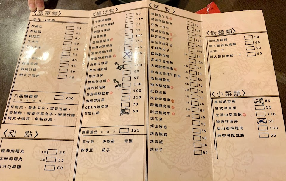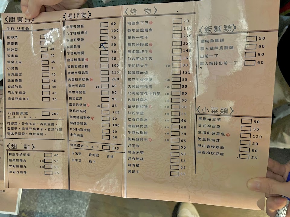 食物的項目有點少,關東煮沒有蘿蔔和香菇覺得很可惜,然後關東煮是不附湯的喔