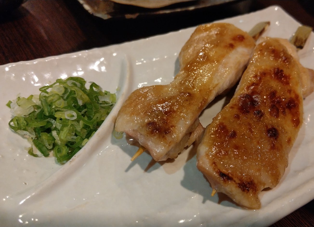 嫩雞腿肉串上面有滿滿的蔥花,可以擠上金桔提出鮮味。