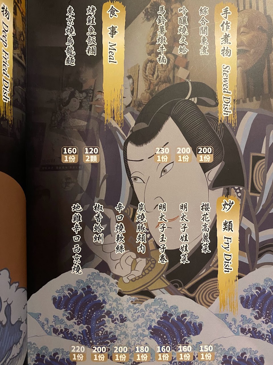 軟殼蟹卷, 豪華 刺身 拼盤, 炸雞軟骨, 鹽烤澎湖大卷, 烤花魚一夜干, 鹽烤文蛤, 鹽烤海大蝦, 炸牛蒡, 酥炸牛蒡, 關東煮