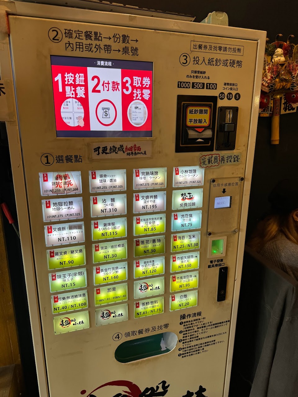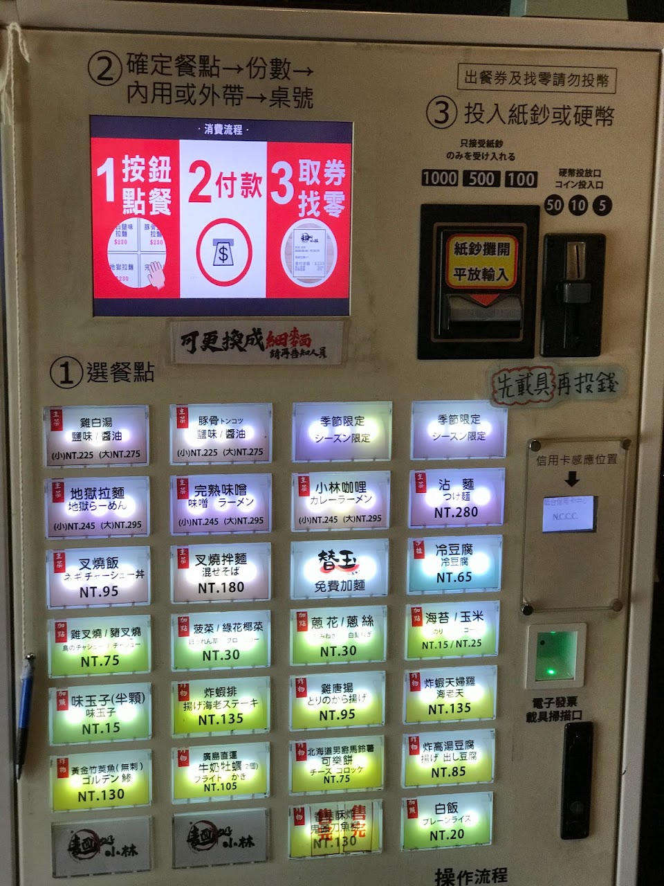 日式風格拉麵店採自助式點餐,以現金或信用卡付款。本次單點雞白鹽味(小)、地獄拉麵中辣(小)及冷豆腐,可依個人喜好選擇麵體、湯頭鹹度。雞白湯頭濃郁,麵體Q彈,內含些許蔬菜、溏心蛋半顆及叉燒兩片,會再造訪!