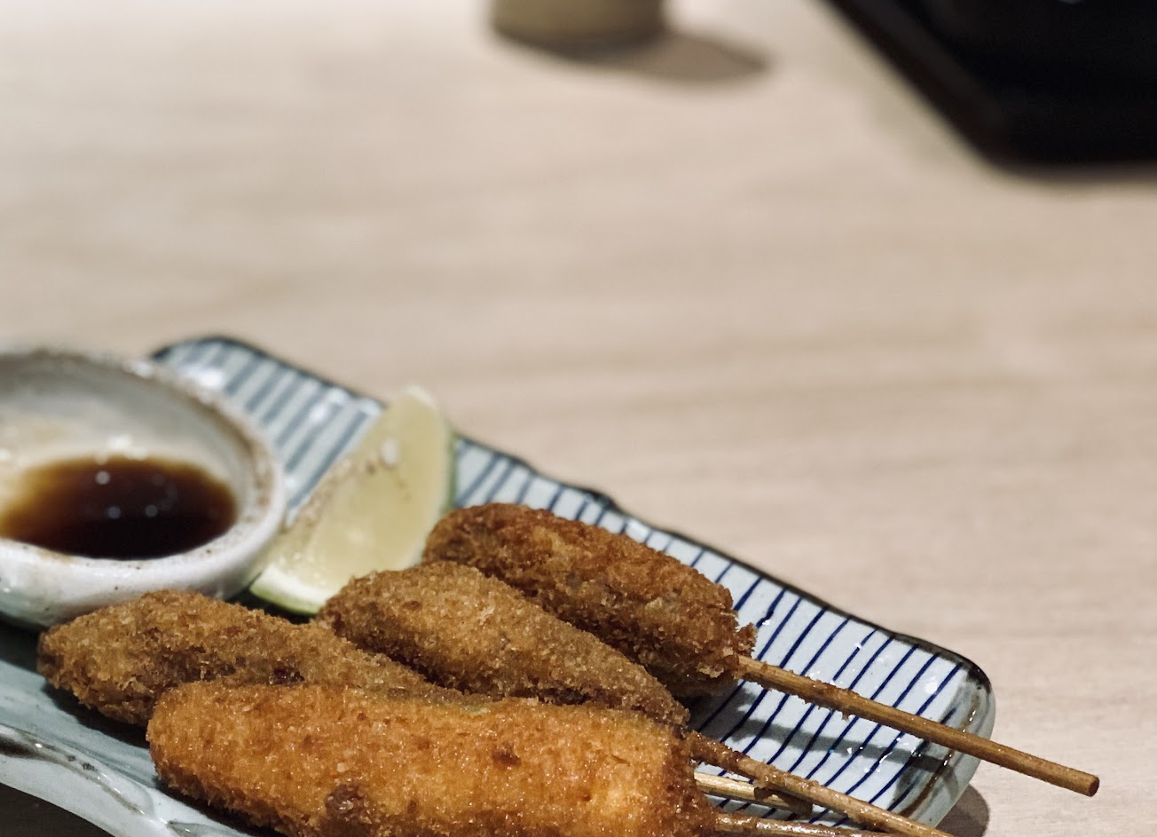 覺得,這裡的炸牛排,跟以前吃過的還是不太一樣,以前如果不用小火爐烤一下就覺得很難咬,但這裡的不會,我都沒用到小火爐就吃完了,而且有肉汁,肉很柔軟好吃,炸串也很好吃,淋上檸檬超好吃的,麵皮炸的很酥脆好吃,在炸串裡好像會有一個是蔬菜類的,吃到的是南瓜,南瓜感覺有點硬,但南瓜本身是好吃的,很甜,炸牛排也有三種醬料可以沾,咖哩跟日式醬油、,還有一個可能是酸的醬,都很好吃,沾玫瑰鹽(在桌上的調味罐裡)也很好吃,而且芥末不知是不是現磨的吃起來一點都不會嗆很好吃,而且服務人員也會在旁邊詢問是否需要加菜,就會幫你加一大坨菜,吃到爽