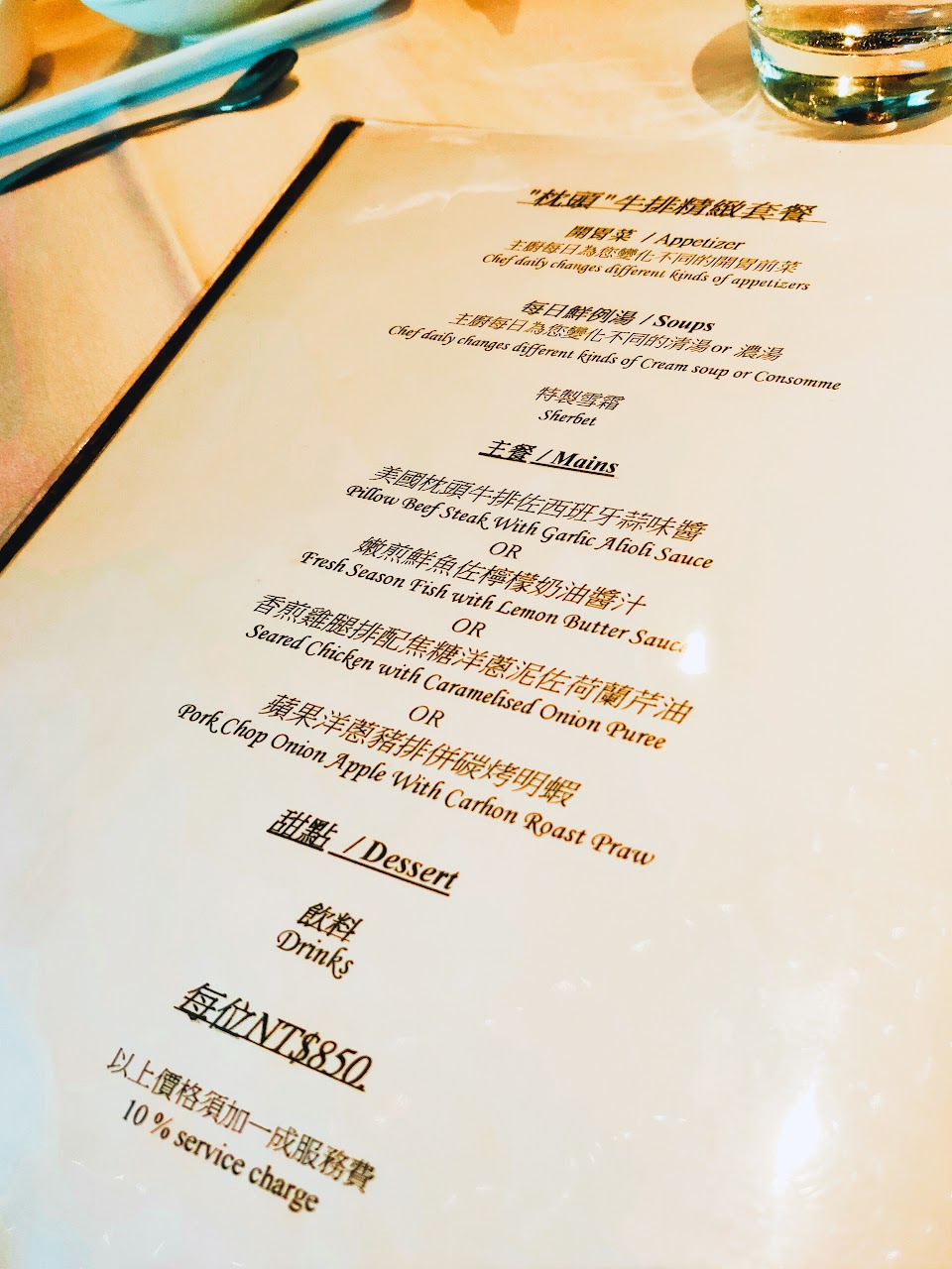 用餐氣氛不錯、服務人員很親切、有耐心,今天選擇「枕頭牛排」及「香煎雞腿排」套餐;開胃前菜很精緻、一口下去有驚艷的味覺感,好吃!例湯不馬虎-牛蒡牛肉清湯,味道濃郁、卻是爽口,可以!主餐-雞腿排,皮酥脆、肉質軟嫩不柴,搭配特調醬汁剛剛好;表妹的牛排選擇七分熟、不過熟、肉質也是軟嫩多汁;餐後甜點-法式甜點盤,每一口都是幸福感;整體來說,沒有失望的部分,有機會再來品嚐不同的餐點。