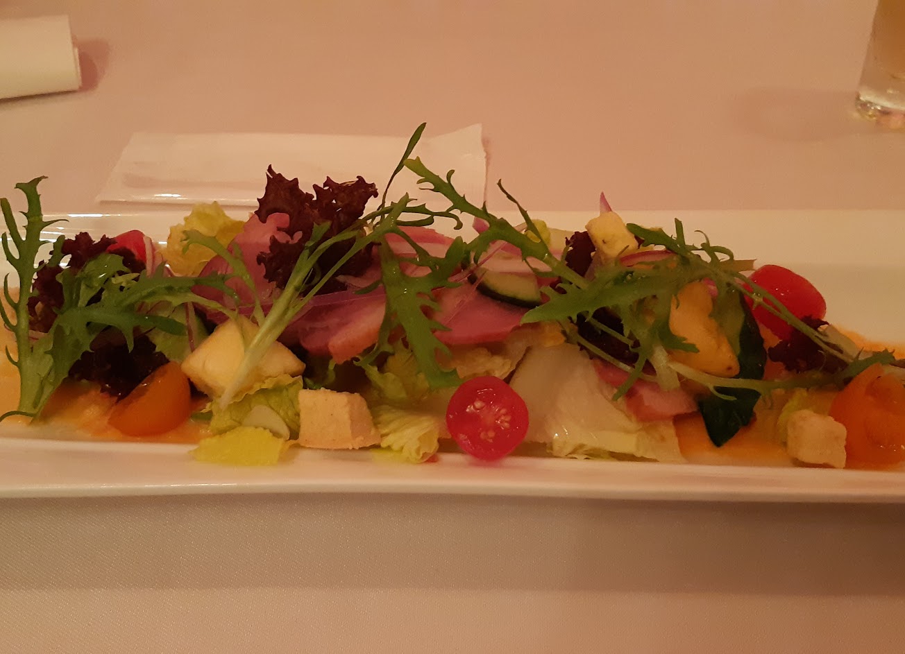 1.前菜的炸丸子比夜市的小上海花枝丸還難吃。 2.麵包就是瘋狂掉屑屑,不知道在掉什麼意思的。 3.湯品是唯一還不錯,南瓜濃湯跟牛肉清湯都還可以。 4.那個三部曲沙拉,夭壽喔真的不知道為什麼那麼像台式合菜的前菜大拼盤。 5.肋眼牛排放在加熱的鹽碗上,整個超柴超硬,沒有牛肉味,中間附的小菜玻璃管,我真的發誓就是冷凍蔬菜玉米粒,調味超難吃,我真的看不懂什麼意思。 6.霜降牛還算好一點,可是怎麼辦,我切牛肉還是切到手腕快受傷。 7.甜點更恐怖了,水果完全不甜。