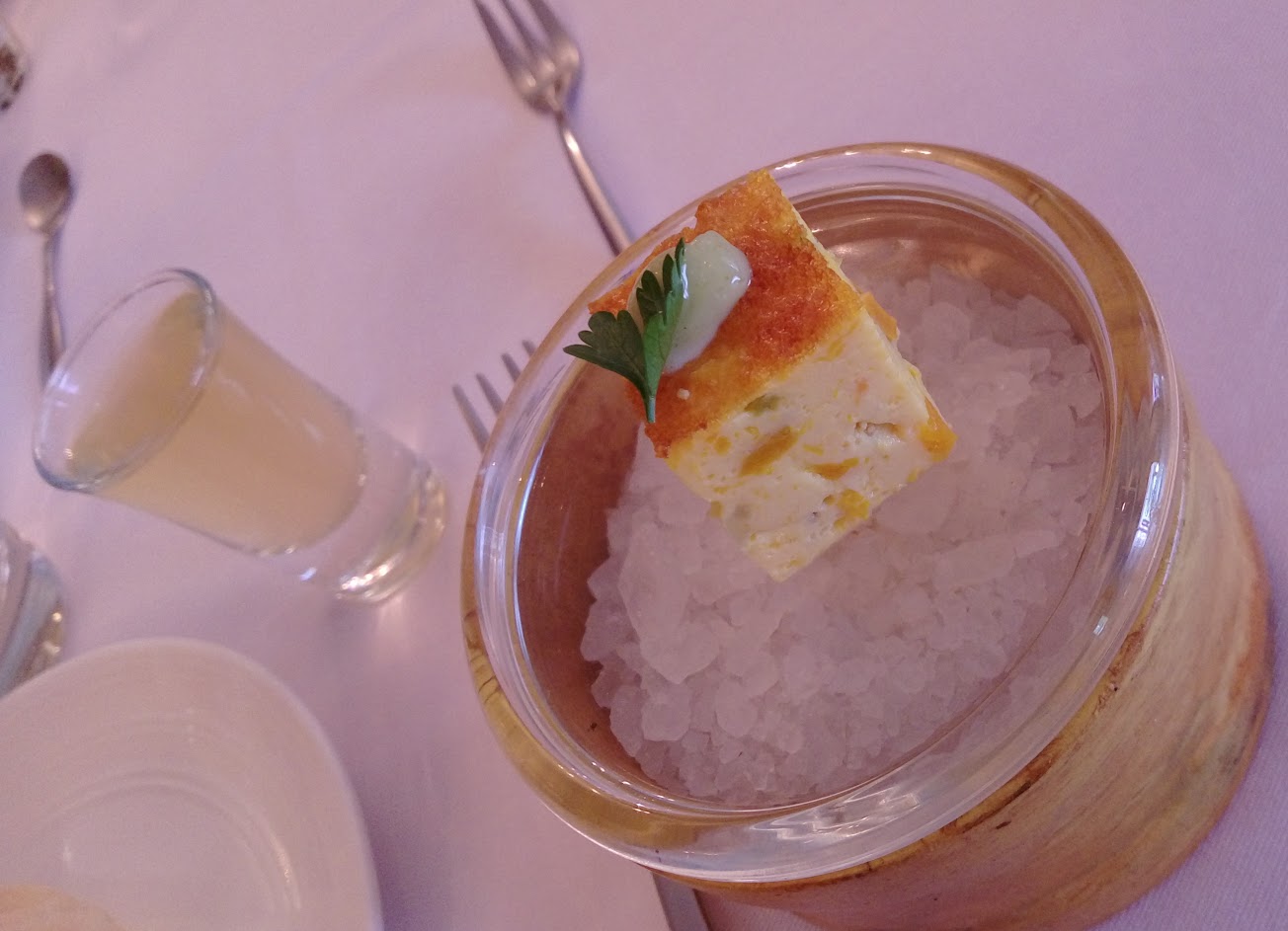服務生先倒上免費招待的氣泡水~ 接這上一顆圓圓的法式麵包,特別的是沾醬部份讓人為之驚艷,看似不起眼,有種美奶滋的微甜+蟹膏的重口味(或許是我的錯覺… ?),鹹鹹的搭配帶著餘溫的酥脆麵包殼(超想喊服務員~在來10顆),但…..比較讓我意外的是,第一次遇到服務生竟然沒問我還需要在一份麵包嗎?我小小的期待頓時間有點失落?