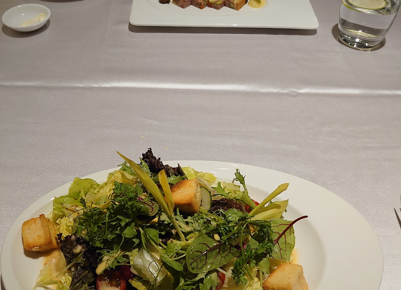 ?開胃菜: 雞肉沙拉的沙拉醬,對我來說太過太清淡,味道上只感受到一點點酸而已,沒辦法蓋住生菜的味道 生魚片滿新鮮的還不錯,只是在法式餐廳吃日式生魚片感覺有點怪怪的?? 熟食二部曲,二部曲分別是肉凍派、燻鮭+蝦子,但我覺得不行❌肉凍ㄉㄨㄞ2的,都很普通啊還是會建議點生菜沙拉?