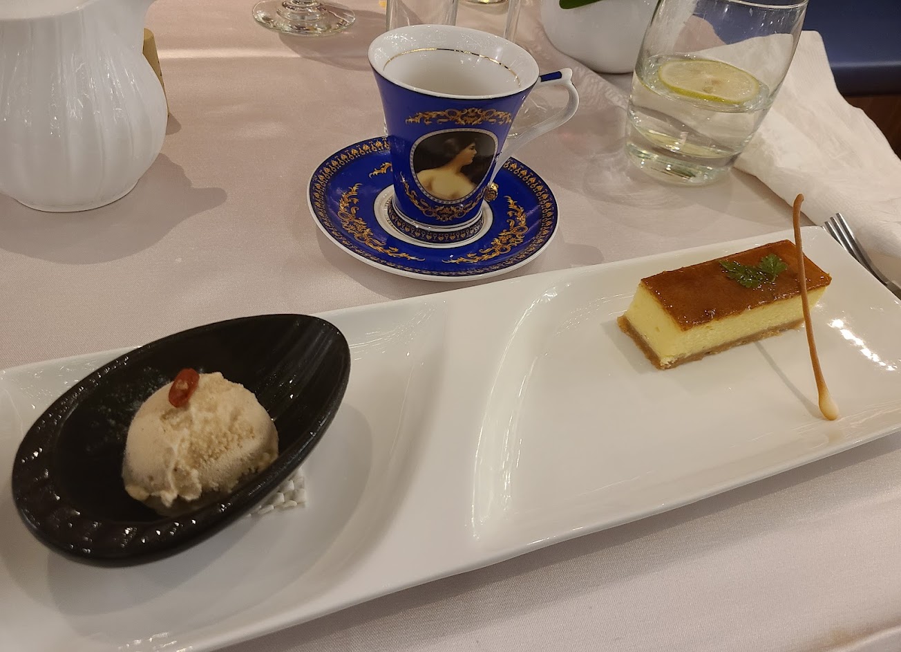 一般套餐的甜點是咖啡慕斯+卡士達泡芙、底層有一片巧克力餅乾(就是那種喜宴餅乾盒的味道) ,咖啡慕斯超級苦我不愛,泡芙不錯吃~