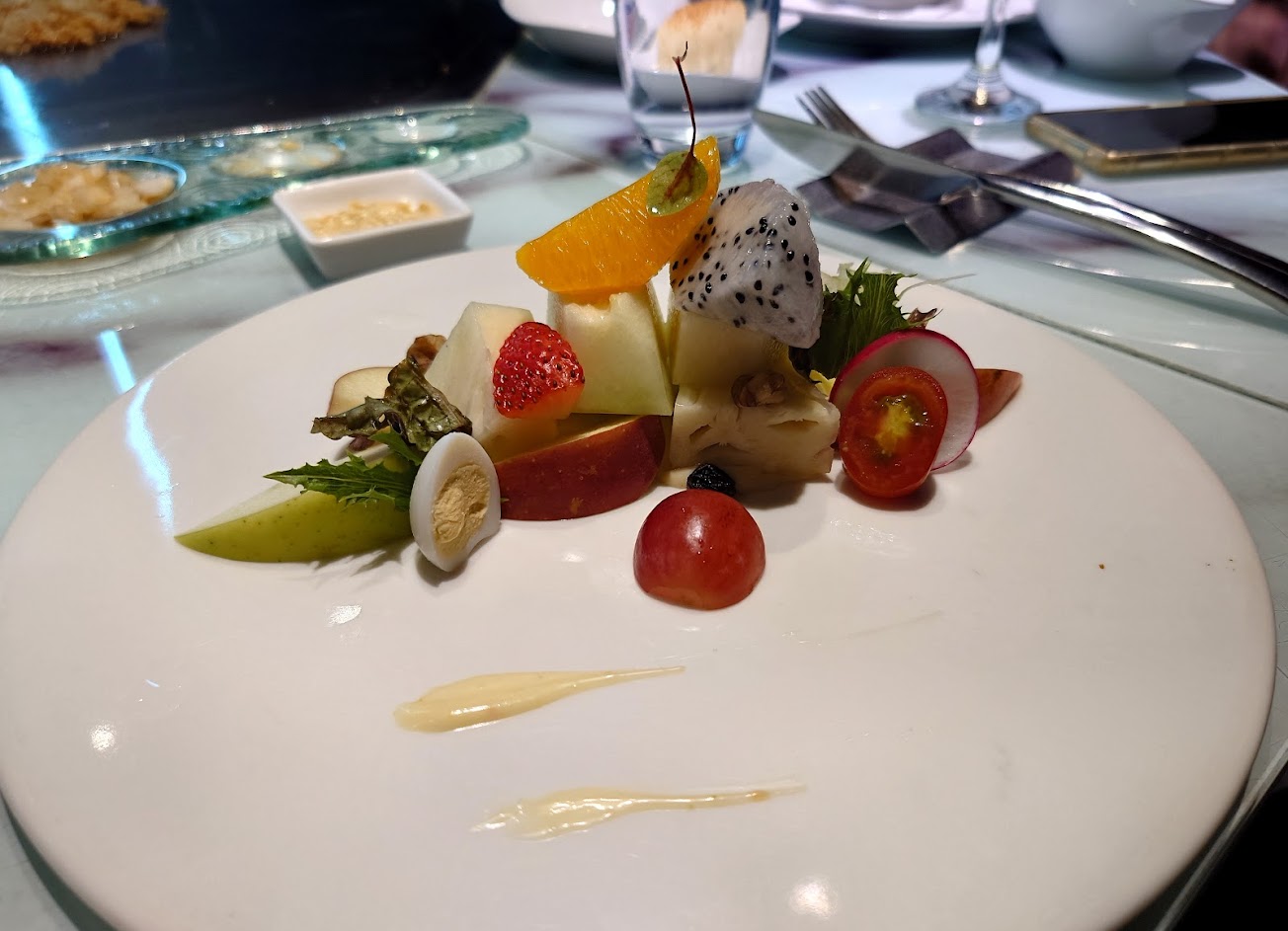 起司麵包熱熱的加上前面小盤子的沙拉醬味道不錯;熱前菜的蝦子偏乾硬;鮑魚海鮮湯頭很鮮,但鮑魚大小跟照片不符;鮮果沙拉排盤五顏六色很漂亮, 吃起來很清爽!